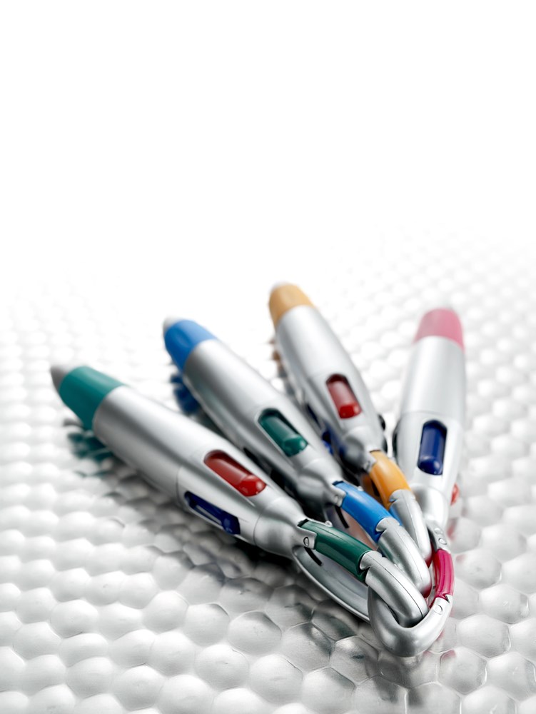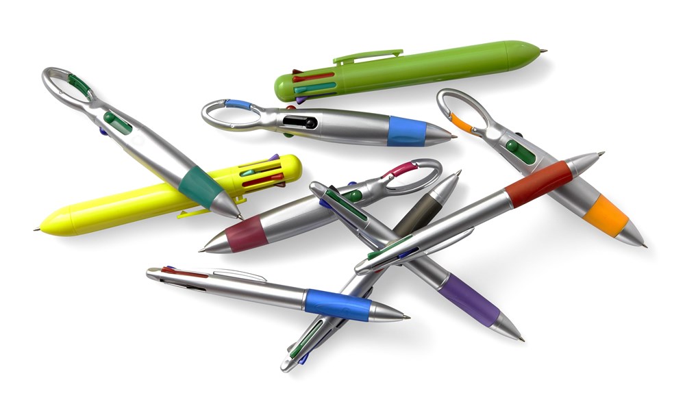 Kugelschreiber aus Kunststoff, mit farbigen Akzenten, 4 verschiedenen Minenfarben (schwarz, blau, grün, rot) und Karabinerhaken.