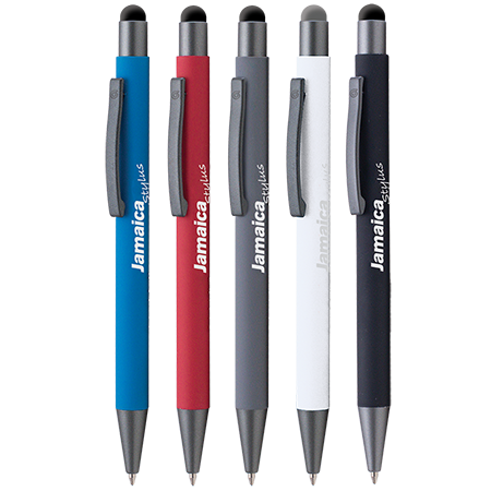 Der JAMAICA Stylus-Kugelschreiber hat ein stilvolles Rubber-Finish, ist auf Touchscreens verwendbar und mit anthrazitfarbenen Details (Drücker, Clip und Spitze) versehen. Der Stift kann mit Lasergravur personalisiert werden und ist blauschreibend.