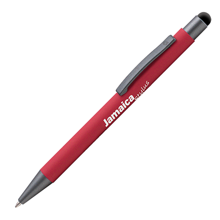 Der JAMAICA Stylus-Kugelschreiber hat ein stilvolles Rubber-Finish, ist auf Touchscreens verwendbar und mit anthrazitfarbenen Details (Drücker, Clip und Spitze) versehen. Der Stift kann mit Lasergravur personalisiert werden und ist blauschreibend.