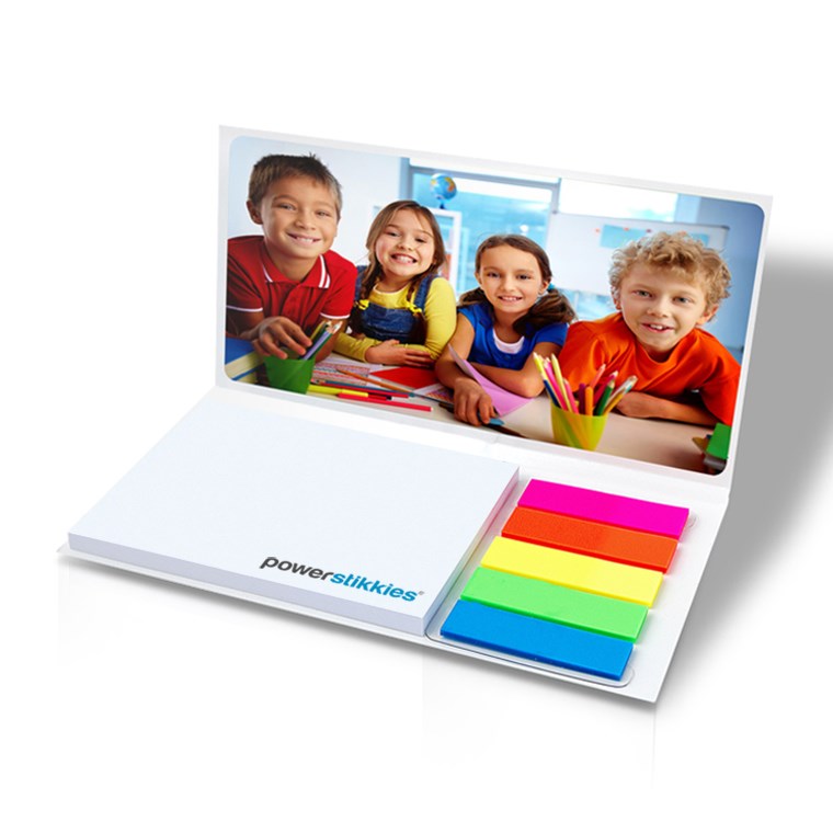 Haftset mit einer Haftnotiz 100 x 70 mm und fünf farbenen Markern aus Kunststoff