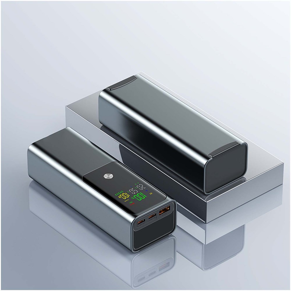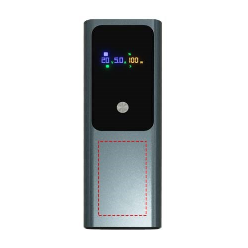Leistungsstarke 100 W (20.000 mAh) Laptop-Powerbank mit zwei USB-C- und einem USB-A-Anschluss zum Aufladen mehrerer Geräte unterwegs. Ausgestattet mit einem smarten TFT-Display zur Anzeige des Ladezustands in Echtzeit. Verpackt in einem Beutel aus Recyclingbaumwolle und geliefert in einer Geschenkbox aus recyceltem Karton.