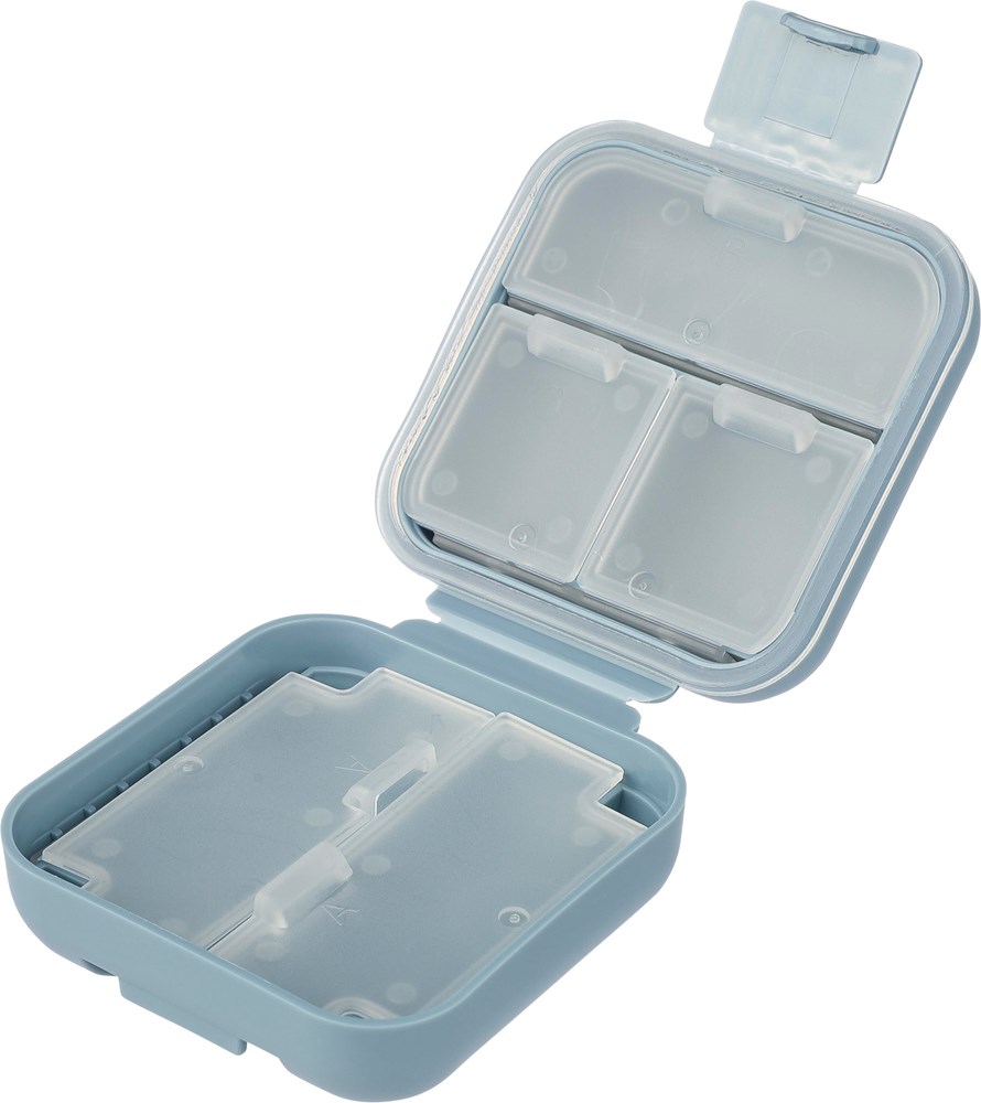 PP- Tablettendose mit 5 einzelnen Fächern, jedes mit eigenem Deckel. Mit Clipverschluss für eine sichere Aufbewahrung.