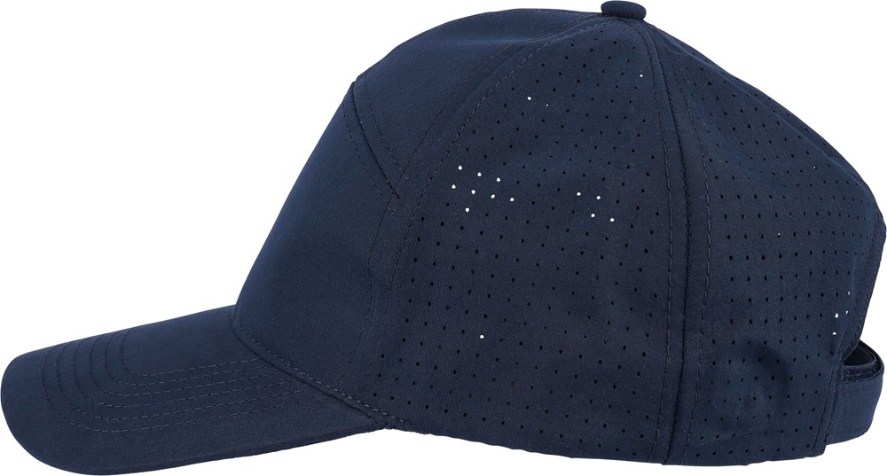 Mütze aus Polyester mit gelaserten Luftlöchern auf der Rückseite. Ausgestattet mit einem 7-Panel-Design mit Frontpanel und 7 cm Schild. Verstellbar, atmungsaktiv, ohne PU-Etikett.