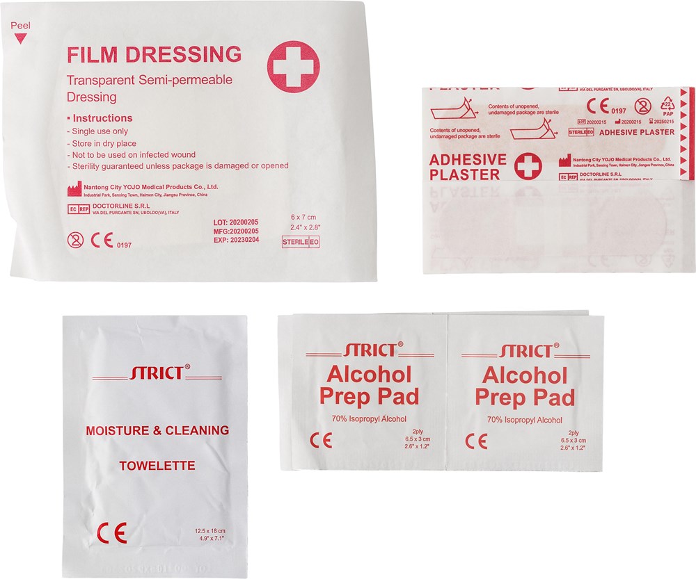 Notfall-Set im Polyester-Beutel, mit Kordelzug, bestehend aus 5 Pflastern, Kompresse, 2 Wundtüchern, Desinfektionstuch. Dieses Produkt darf nur innerhalb der Europäischen Union verkauft und geliefert werden.