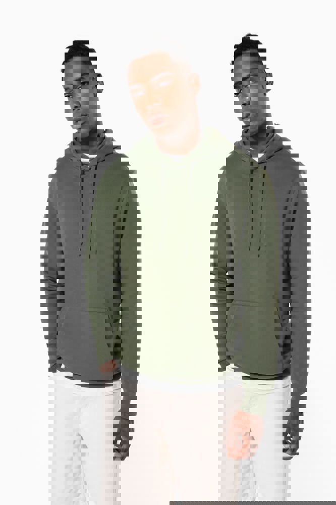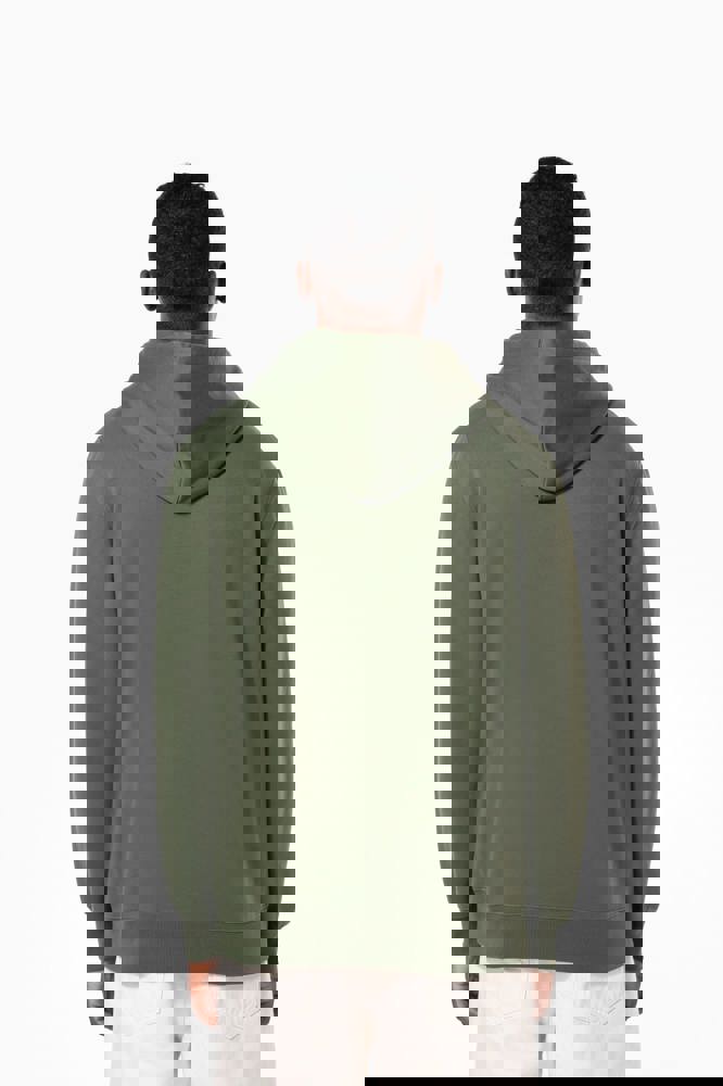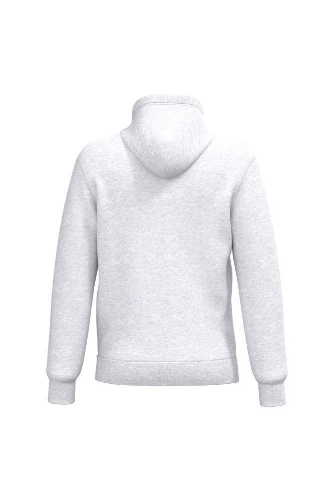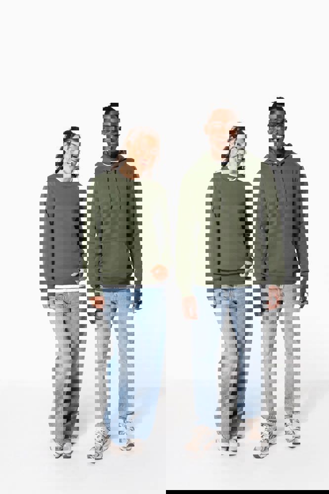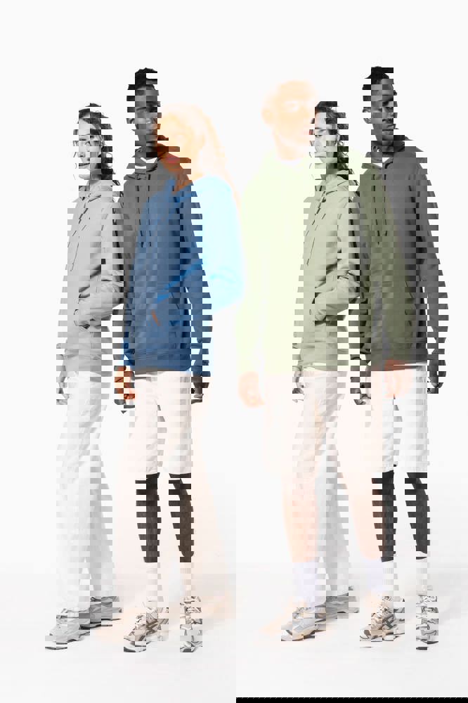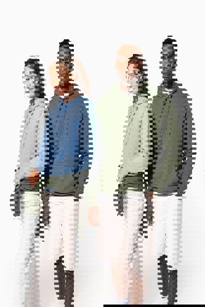 50 % Ringspun-Baumwolle / 50 % recycelter Polyester post-consumer. Gebürstetes Molton. Gerader Schnitt. Zugeschnitten genäht. 2x1 schlauchförmiges Strickbündchen für eine optimale Verarbeitung an Kragen, Ärmelabschlüssen und am unteren Saum. Kängurutasche. Gefütterte Kapuze aus Baumwollpolyester-Jersey mit flachem Kordelzug. Farblich abgestimmtes Jersey-Nackenband auf Krageninnenseite. Kein Markenetikett am Halsausschnitt, nur Größenangabe, zur einfacheren Veredelung.