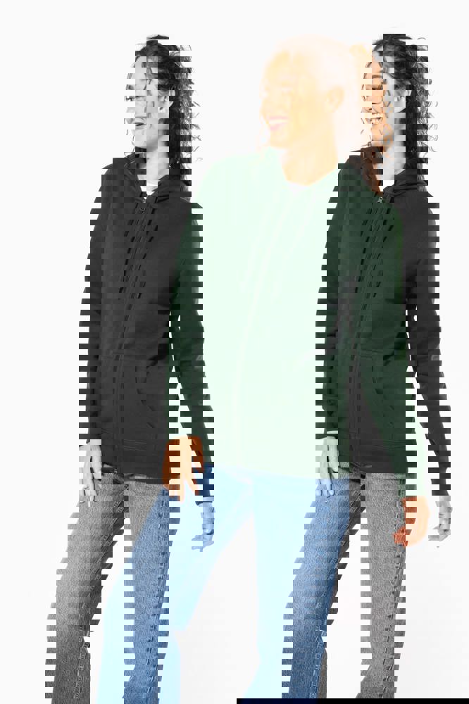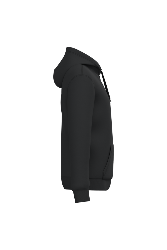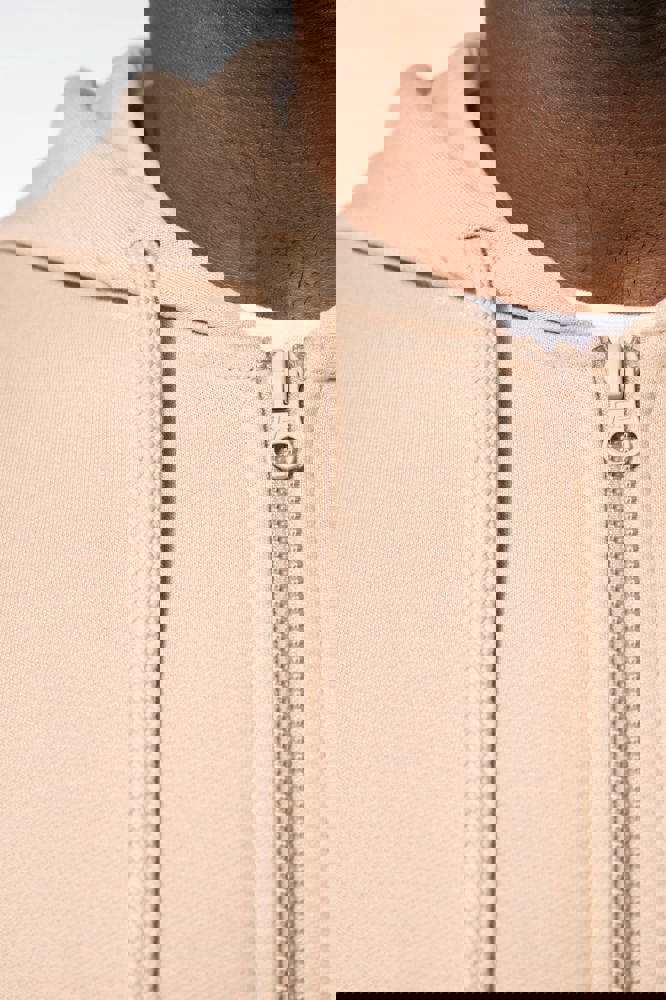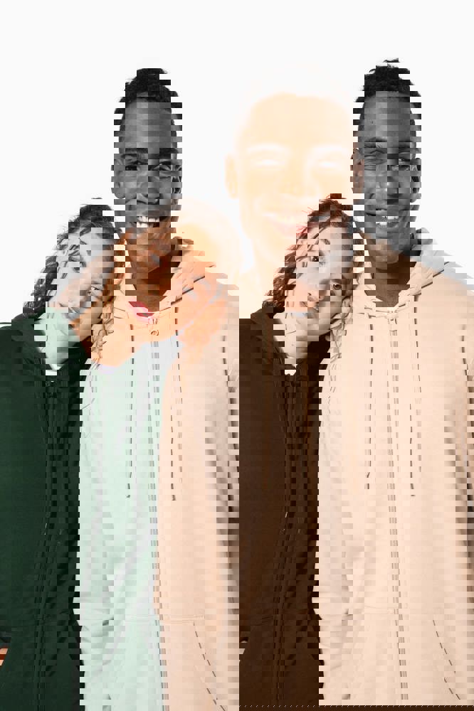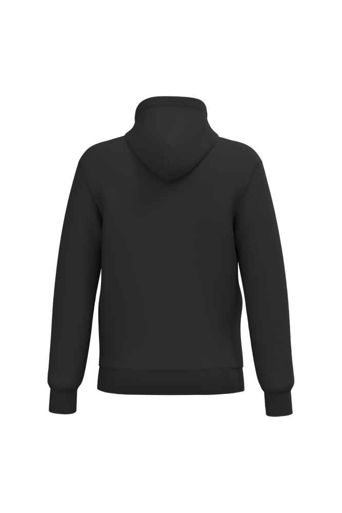 50 % Ringspun-Baumwolle / 50 % recycelter Polyester post-consumer. Gebürstetes Molton. Gerader Schnitt. Zugeschnitten genäht. 2x1 schlauchförmiges Strickbündchen für eine optimale Verarbeitung an Kragen, Ärmelabschlüssen und am unteren Saum. Kängurutasche. Reißverschluss aus Nylon. Gefütterte Kapuze aus Baumwollpolyester-Jersey mit flachem Kordelzug. Farblich abgestimmtes Jersey-Nackenband auf Krageninnenseite. Kein Markenetikett am Halsausschnitt, nur Größenangabe, zur einfacheren Veredelung.