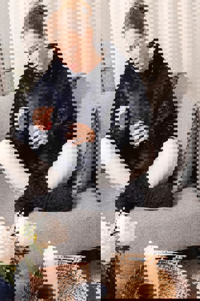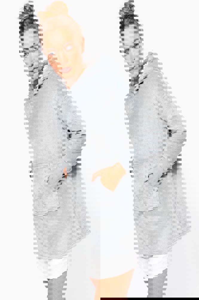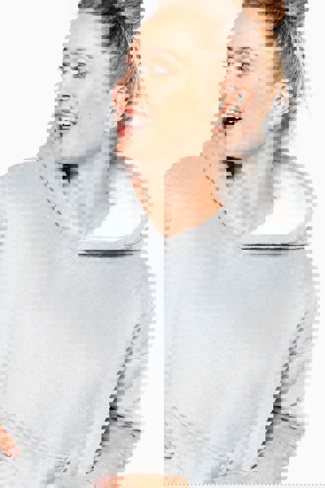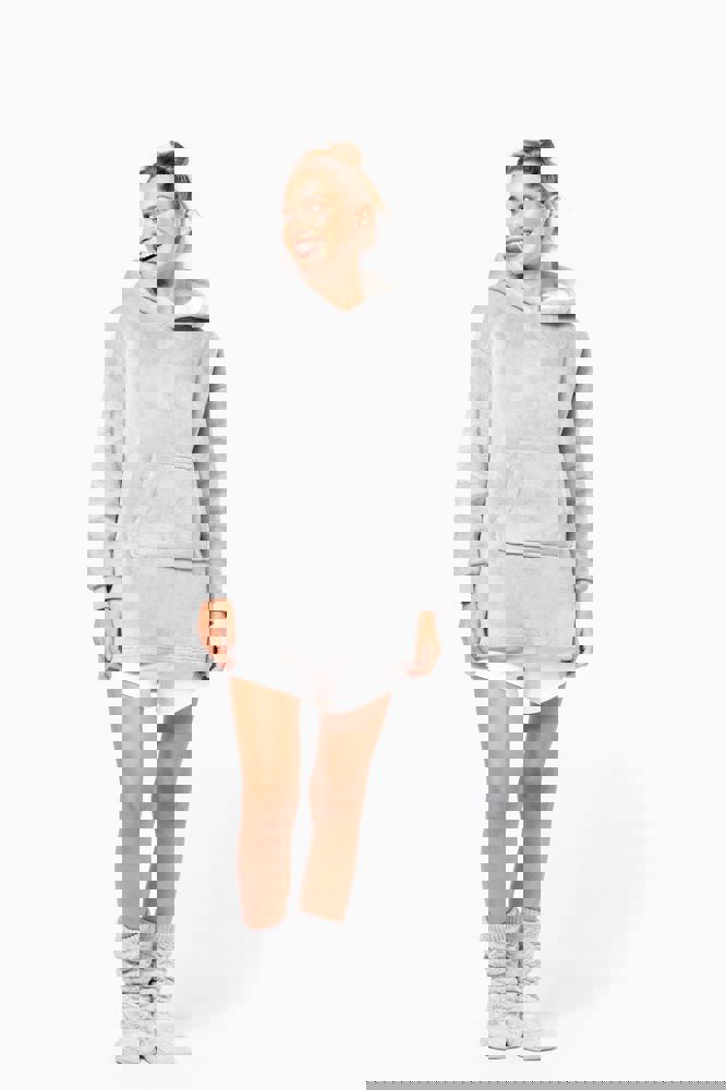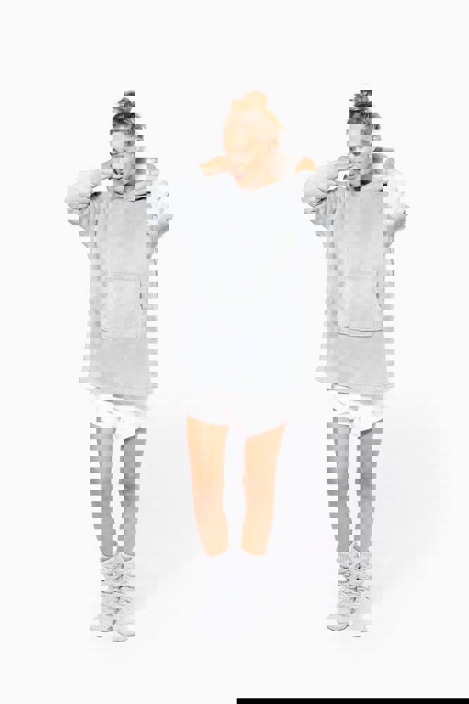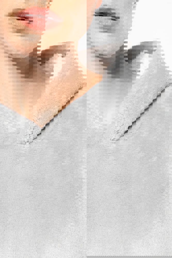 100 % Polyester. Oversize-Schnitt mit überschnittener Schulterpartie. Doppelseitiger Stoff, Außenseite aus Velours, Innenseite aus Sherpa. Auf der Vorderseite gekreuzte Kapuze mit zwei Einsätzen und Finish mit doppelter Ziernaht. Lange Ärmel mit 1x1 Strickbündchen. Elasthan in Strickbündchen an den Ärmelabschlüssen, um Verformungen zu vermeiden. Kängurutasche. Unterer Saum mit doppelter Ziernaht. Kein Markenetikett am Halsausschnitt, nur Größenangabe, zur einfacheren Veredelung.