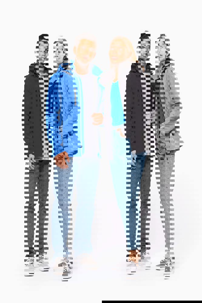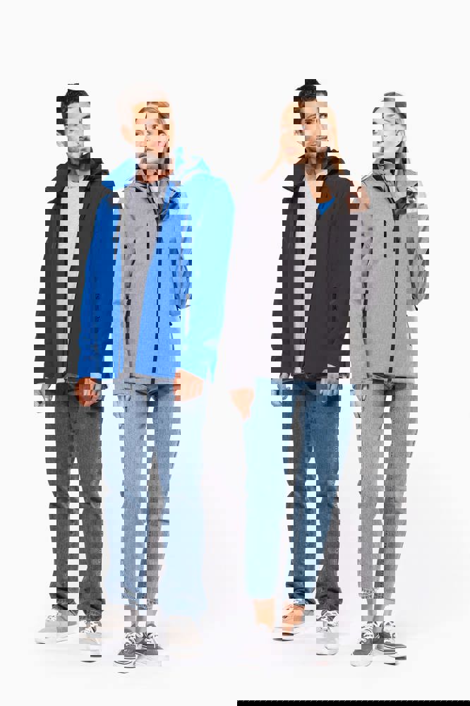 95 % Polyester / 5 % Elasthan. Atmungsaktives, 3-lagiges Verbundgewebe. 3.000 g/m²/24 h und wasserdicht 8.000 mm. Außenmaterial: 95 % Polyester / 5 % Elasthan. Atmungsaktive Mittelmembran. Innenmaterial: Mikrofleece. Leicht bedruckbarer Stoff. Gerader Schnitt. Reißverschluss. 2 Reißverschlusstaschen auf der Vorderseite und ein Reißverschlussfach auf der rechten Seite des Trägers. Über Druckknöpfe abnehmbare Kapuze mit Reißverschluss. Per Reißverschluss abnehmbare Ärmel. Doppelnähte an Ärmelbündchen und unterem Saum.
