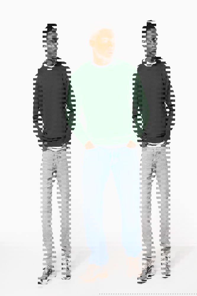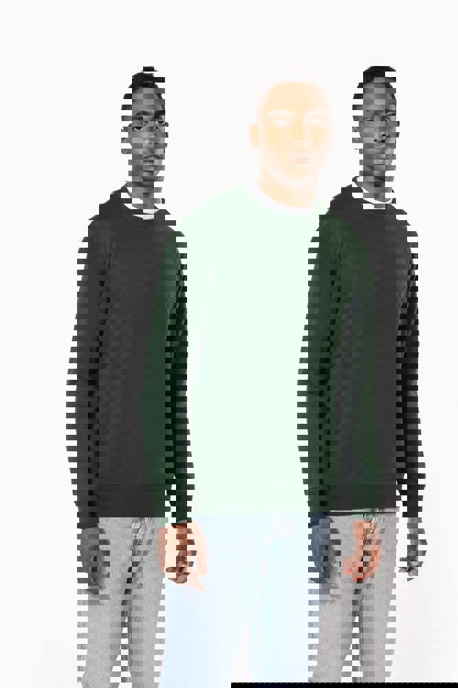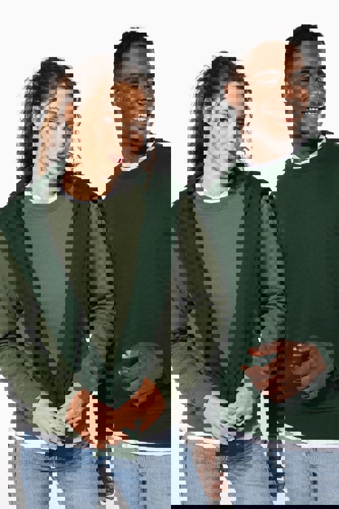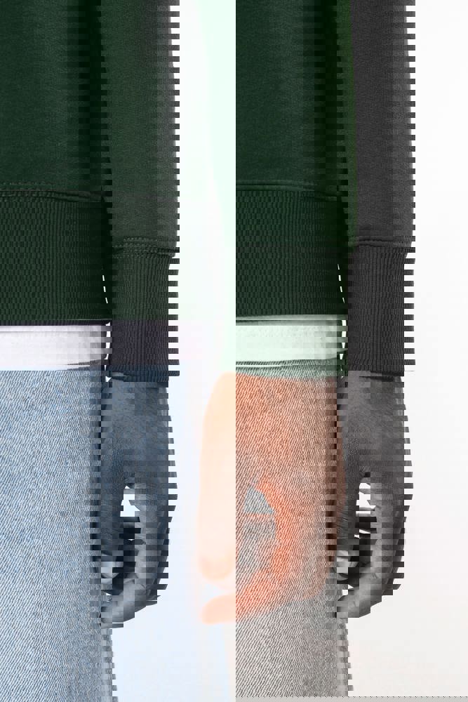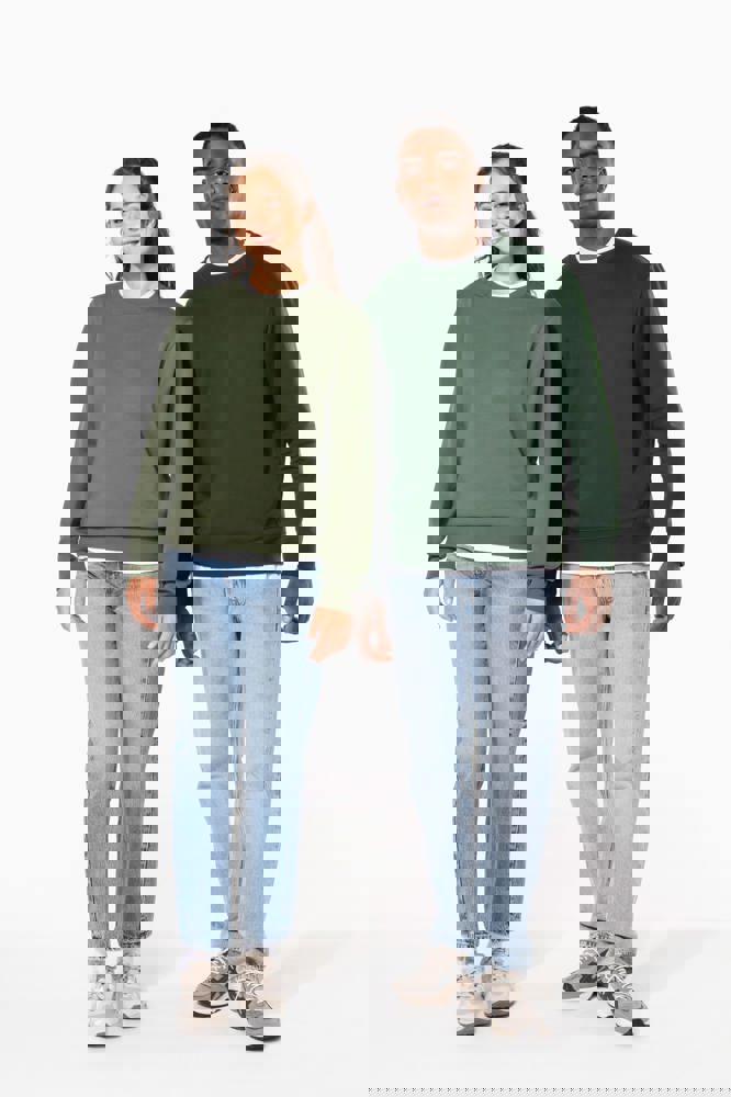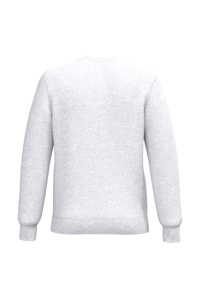 50 % Ringspun-Baumwolle / 50 % recycelter Polyester post-consumer. Gebürstetes Molton. Gerader Schnitt. Zugeschnitten genäht. 2x1 schlauchförmiges Strickbündchen für eine optimale Verarbeitung an Kragen, Ärmelabschlüssen und am unteren Saum. Farblich abgestimmtes Jersey-Nackenband auf Krageninnenseite. Kein Markenetikett am Halsausschnitt, nur Größenangabe, zur einfacheren Veredelung.