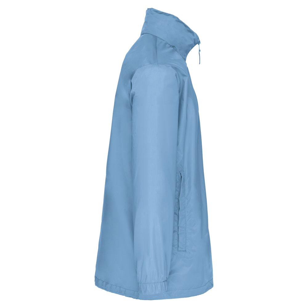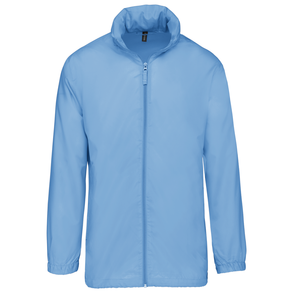 100% Polyester. Im Kragen versteckte Kapuze, mit Klettverschluss. 2 Fronttaschen mit Reißverschluss. Kordelzug am Bund. Gummizug am Ärmelende. Zusammenfaltbar in die Seitentasche (K-WAY® System). Reißverschluss Ton-in-Ton.