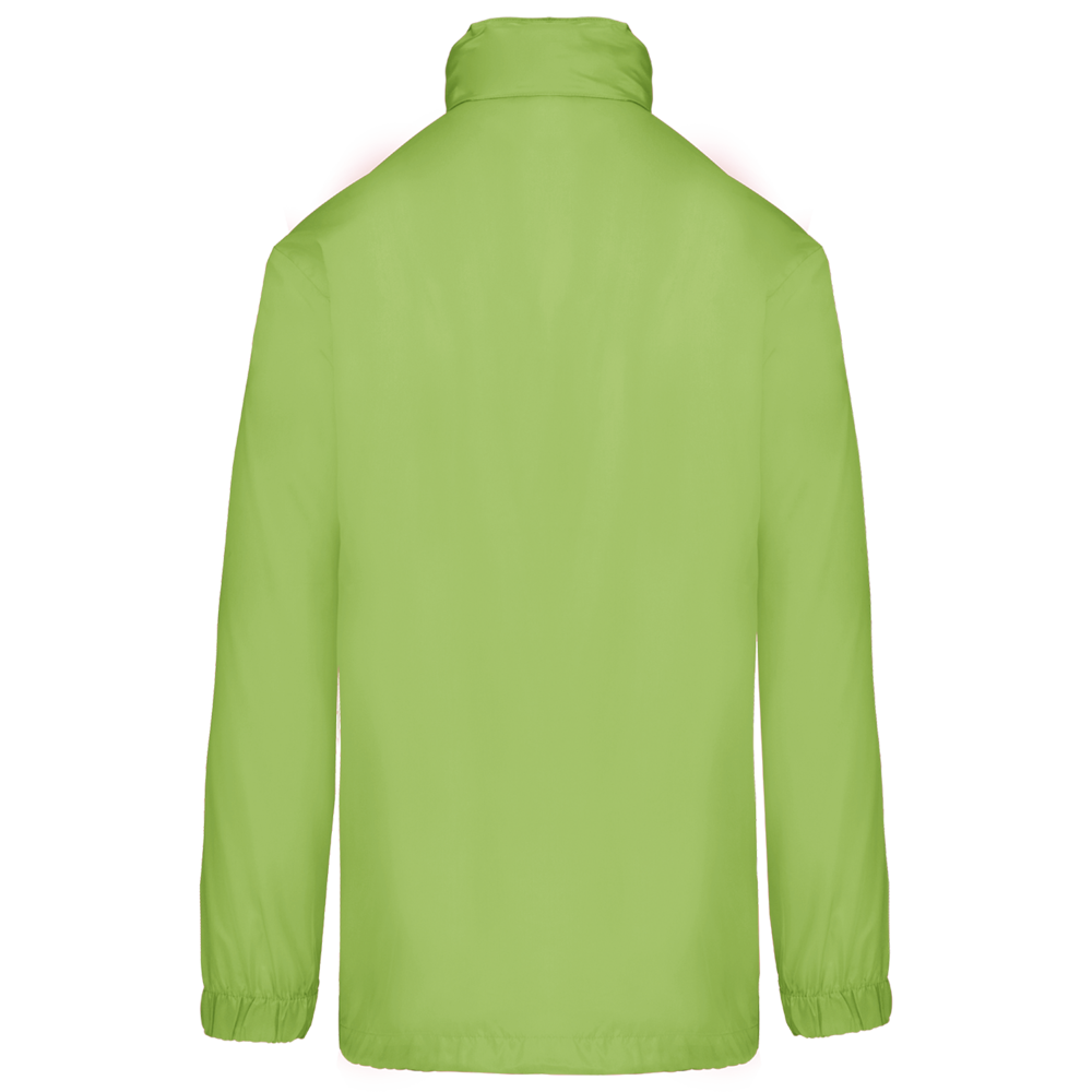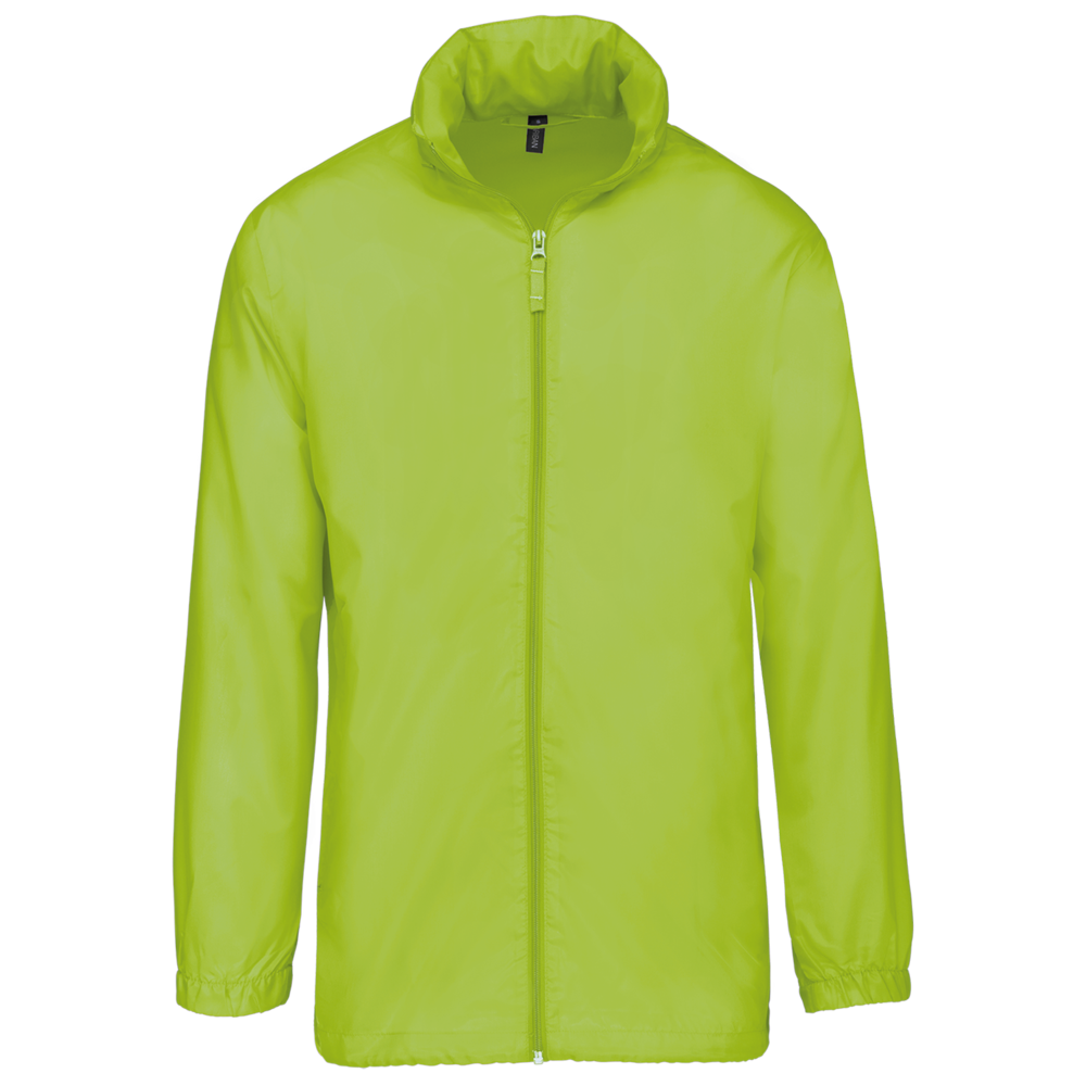 100% Polyester. Im Kragen versteckte Kapuze, mit Klettverschluss. 2 Fronttaschen mit Reißverschluss. Kordelzug am Bund. Gummizug am Ärmelende. Zusammenfaltbar in die Seitentasche (K-WAY® System). Reißverschluss Ton-in-Ton.