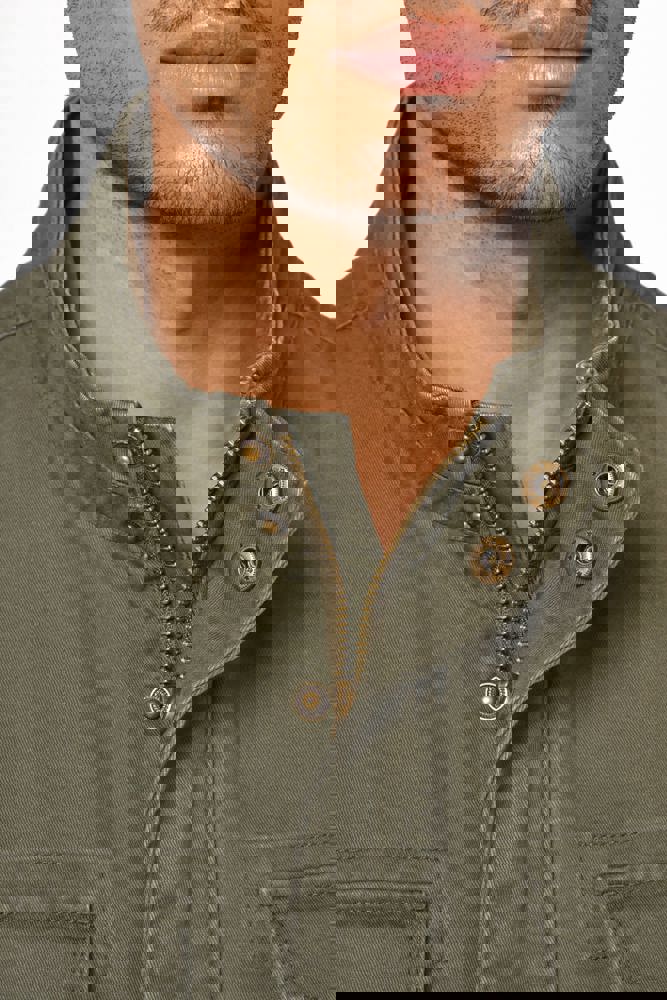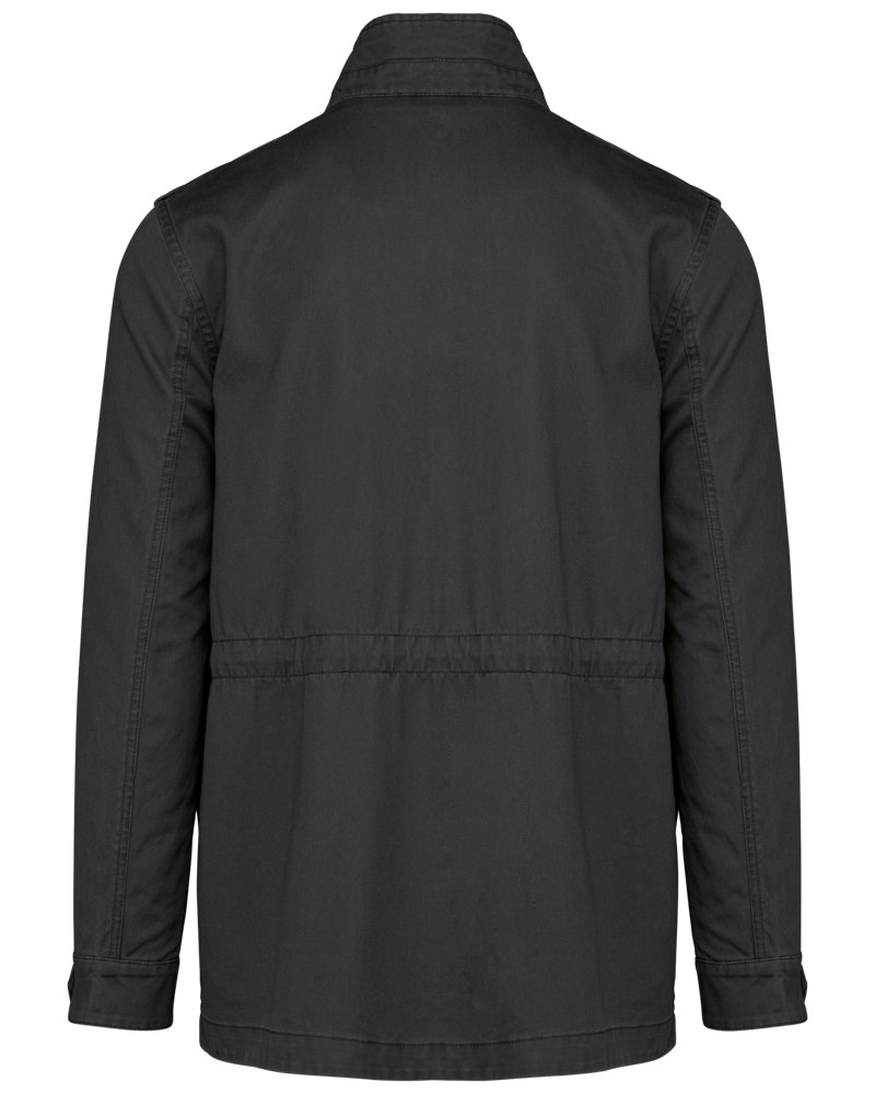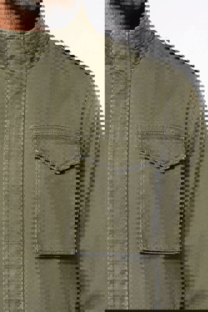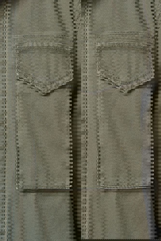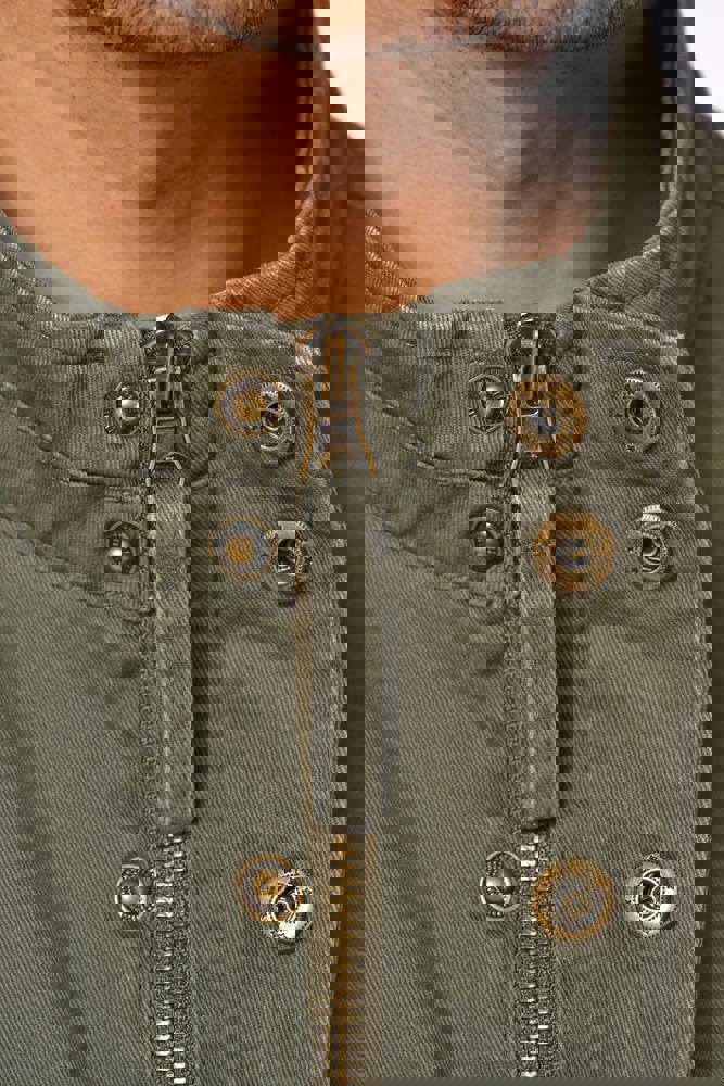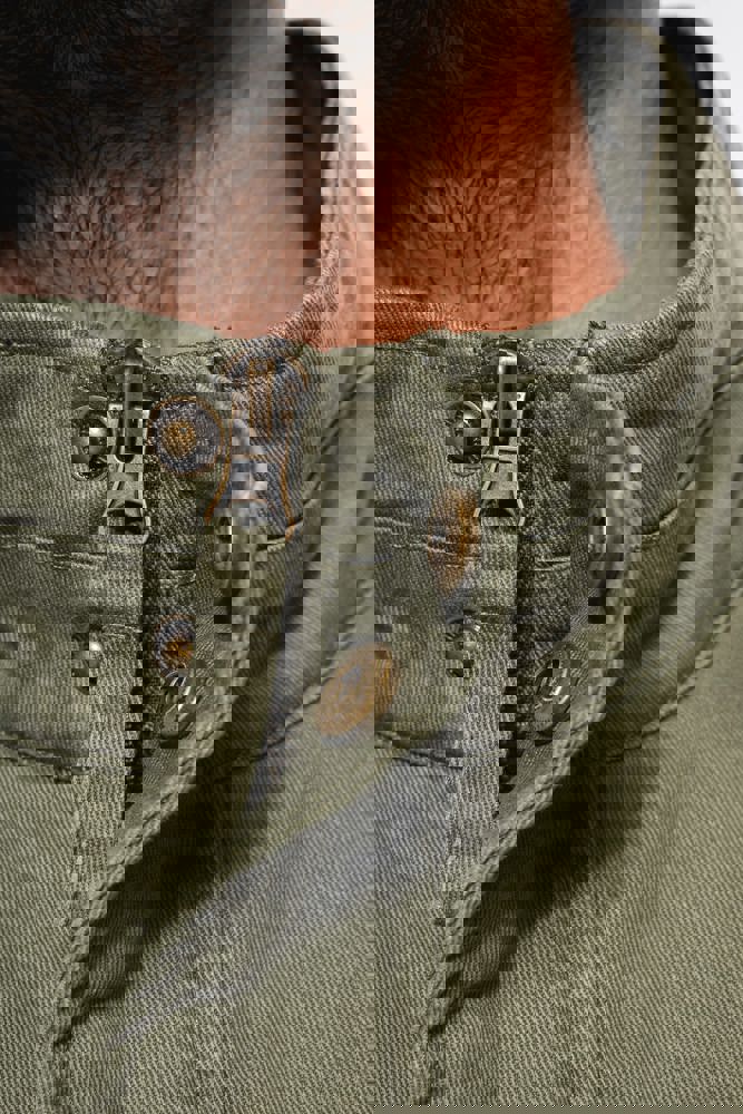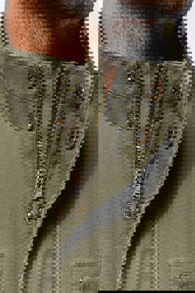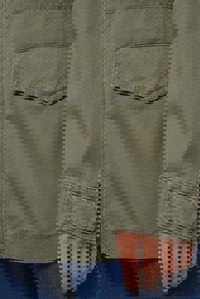 100 % Baumwolle. Twill-Konstruktion. Reguläre Passform. Gewaschene Kleidung. Dadurch kann es zu leichten Farbabweichungen kommen, und jedes Teil ist ein Unikat. Reißverschluss mit Metallschieber und Zuglasche aus Hauptstoff sowie eine Knopfleiste mit unsichtbaren Druckknöpfen in der Mitte vorne. Innenverarbeitung mit Paramentur. Vier Außentaschen mit Druckknopf. Manschette mit dekorativer Leiste, die mit einem Druckknopf gehalten wird. Größenverstellbarer Kordelzug mit Stopper in Lederoptik auf der Innenseite des Kleidungsstücks. Schulterleiste mit Knopf. Innentasche mit Klettverschluss. Halbmond innen für eine leichtere Veredelung mit Lasche innen.