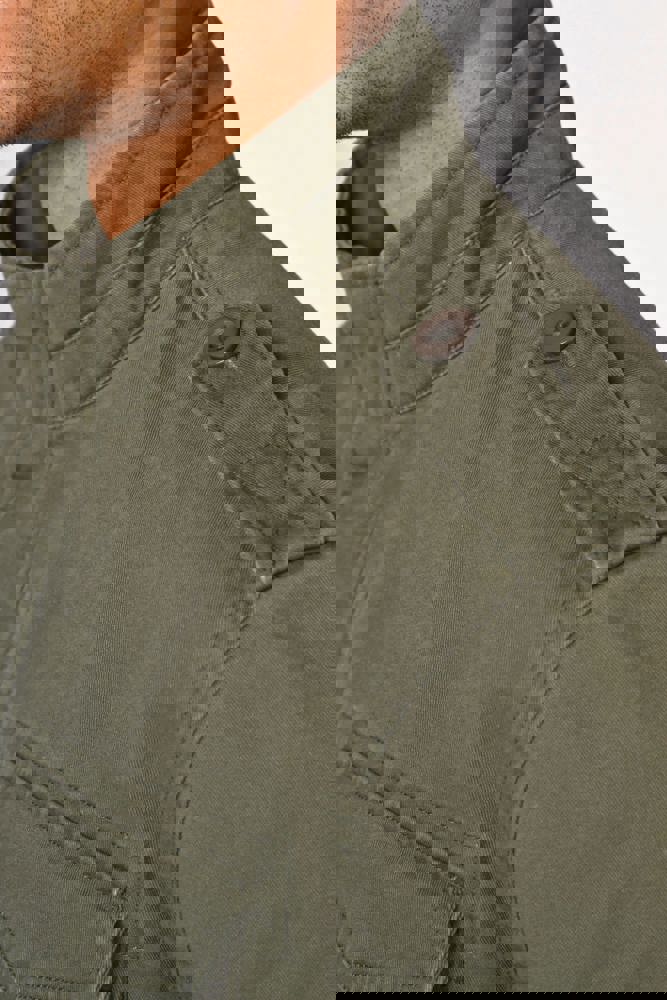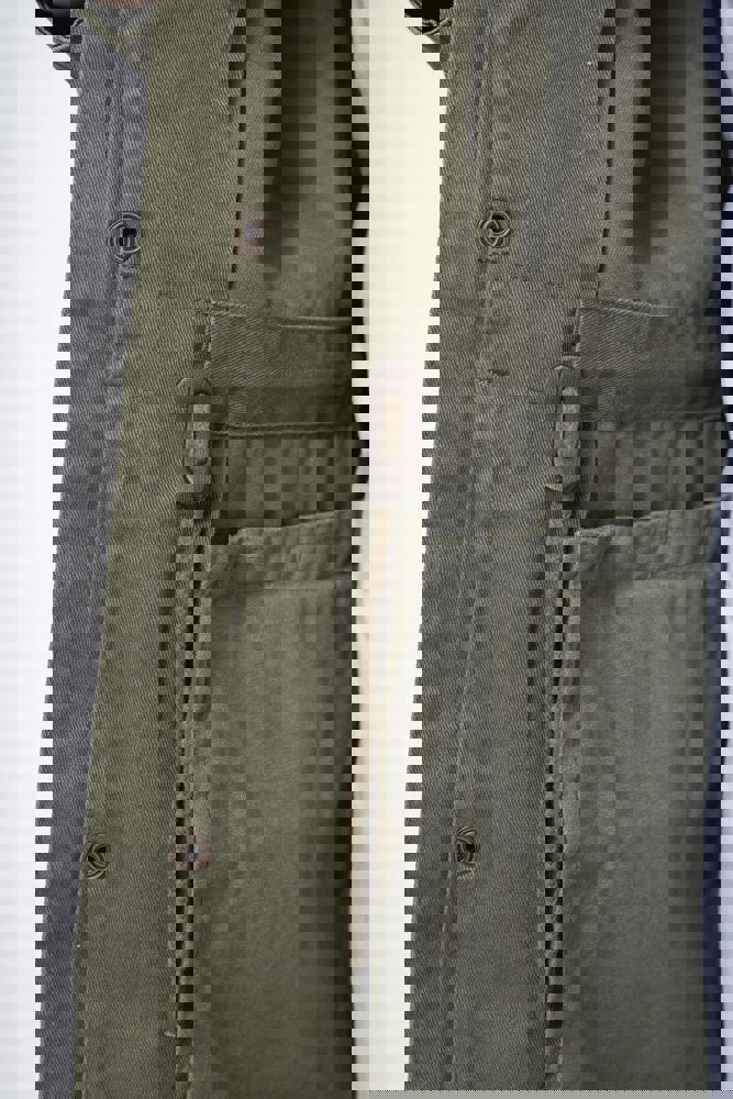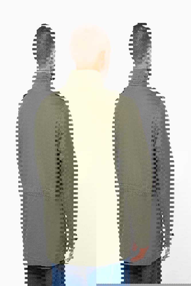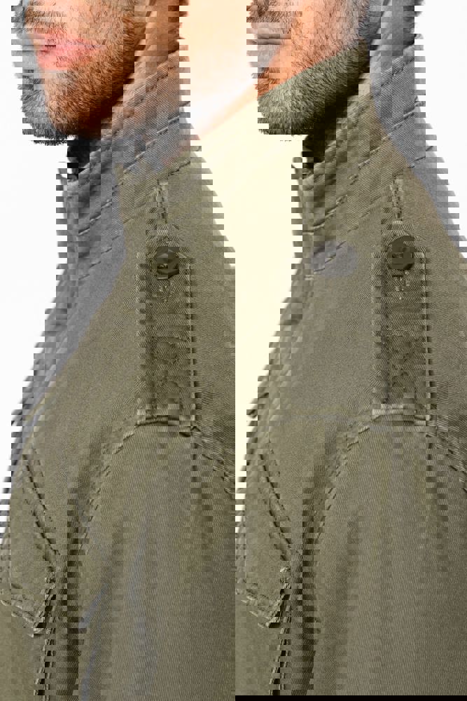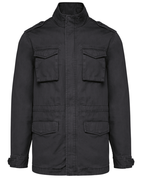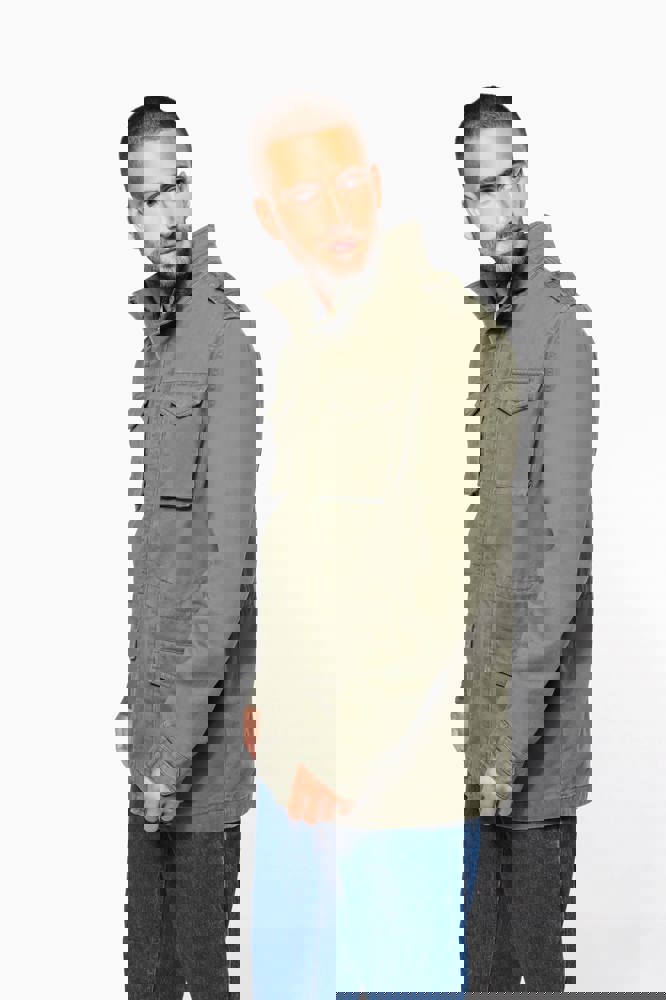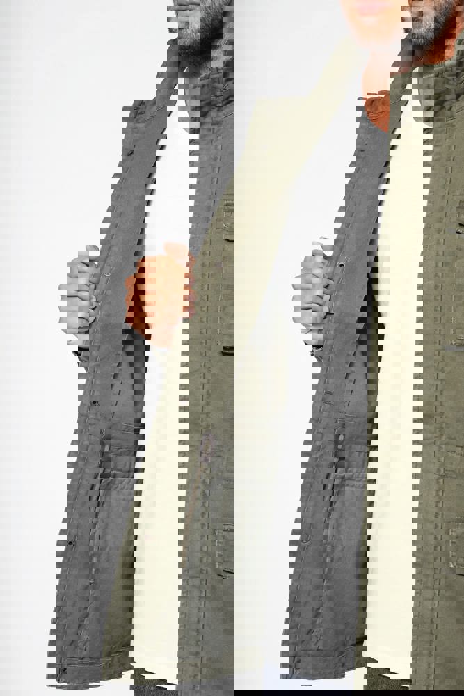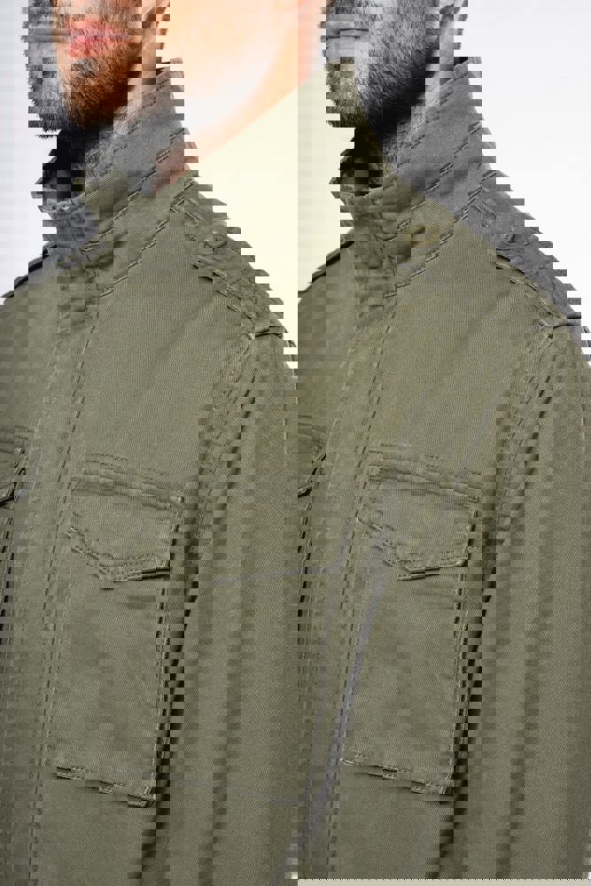 100 % Baumwolle. Twill-Konstruktion. Reguläre Passform. Gewaschene Kleidung. Dadurch kann es zu leichten Farbabweichungen kommen, und jedes Teil ist ein Unikat. Reißverschluss mit Metallschieber und Zuglasche aus Hauptstoff sowie eine Knopfleiste mit unsichtbaren Druckknöpfen in der Mitte vorne. Innenverarbeitung mit Paramentur. Vier Außentaschen mit Druckknopf. Manschette mit dekorativer Leiste, die mit einem Druckknopf gehalten wird. Größenverstellbarer Kordelzug mit Stopper in Lederoptik auf der Innenseite des Kleidungsstücks. Schulterleiste mit Knopf. Innentasche mit Klettverschluss. Halbmond innen für eine leichtere Veredelung mit Lasche innen.