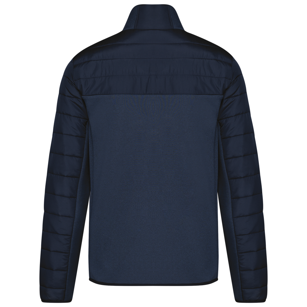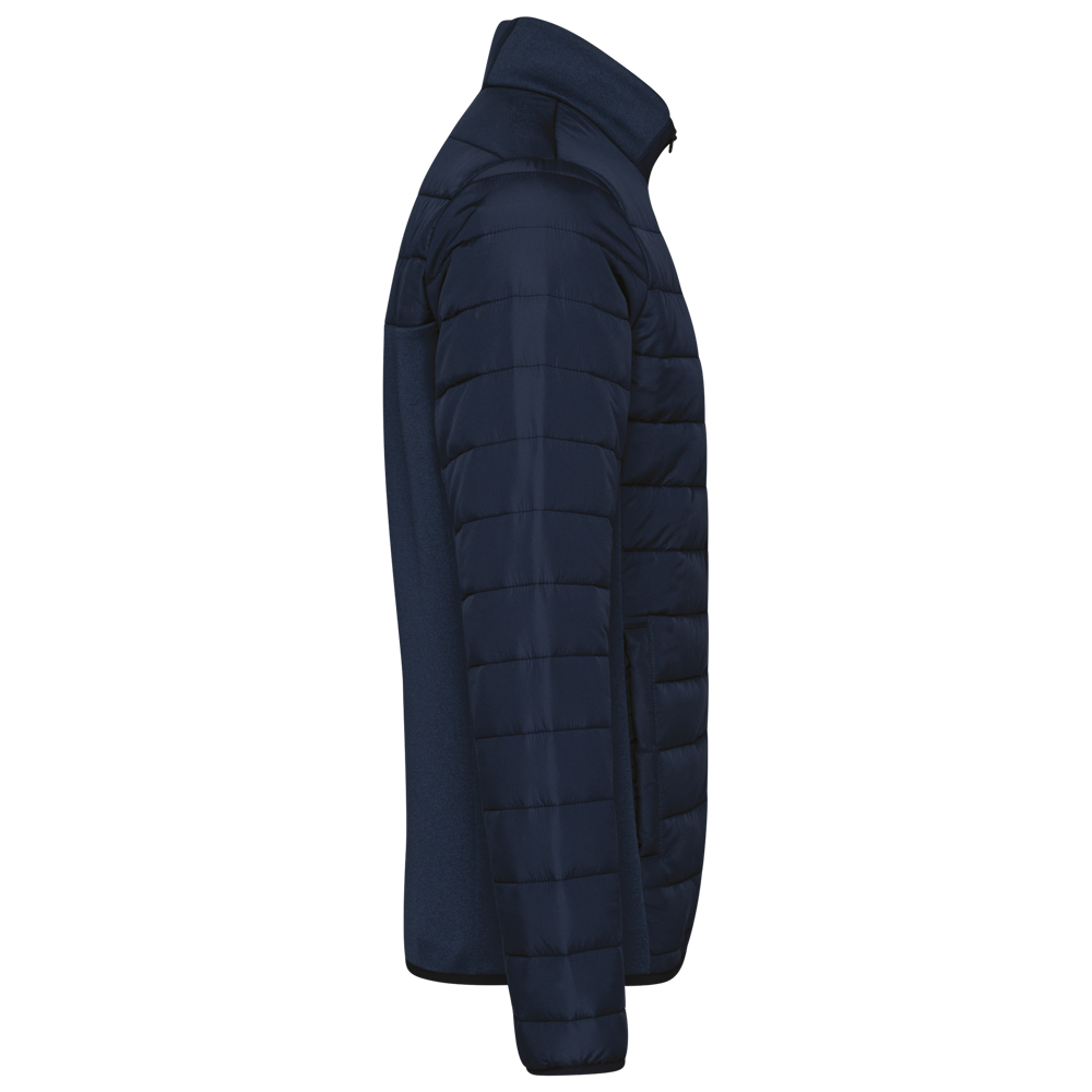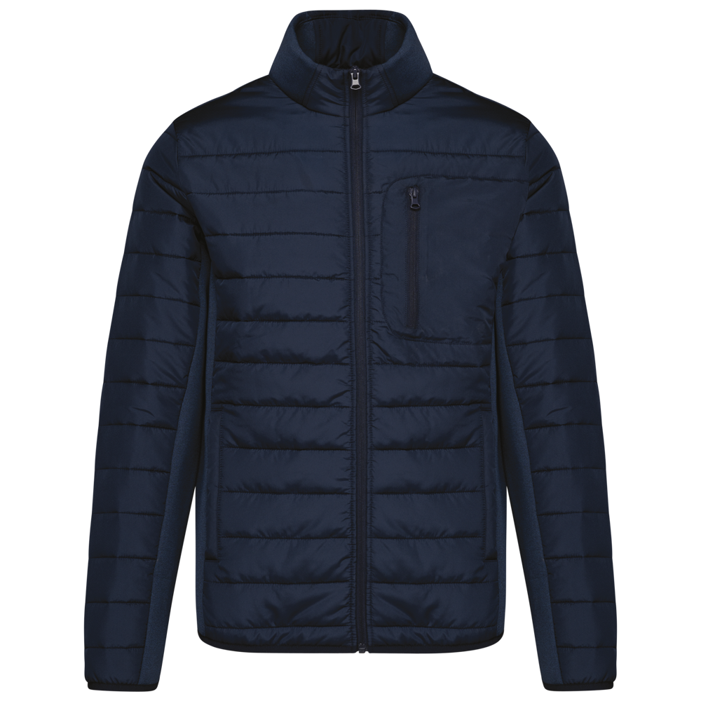 Stoff an Seiten, Rücken, Unterseite der Ärmel und Teil des Kragens: 94 % Polyester/6 % Elasthan. Oberstoff Ärmel, Vorder- und Rückseite: 100% Polyester Pongé 300T mit Polyurethan-Beschichtung. Füllung 100% Polyester 120g. Futter aus 100% recyceltem Polyester Taft 230T. Vorderer Körperteil und hinteres Drittel gepolstert. Vorderseite mit umgekehrtem Nylon-Reißverschluss. 2 seitliche und paspelierte Taschen auf Vorderseite. Aufgesetzte Brusttasche auf der Herzseite, die mit einem umgekehrten Reißverschluss geschlossen wird. Kragen mit Einsätzen aus zwei Materialien. Elastisches Schrägband an Ärmelbündchen und unterem Saum.