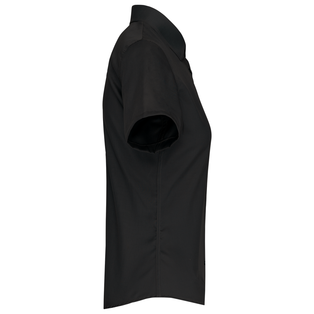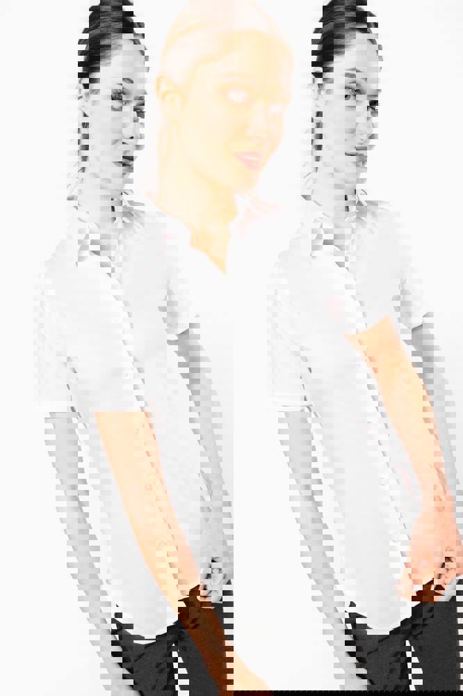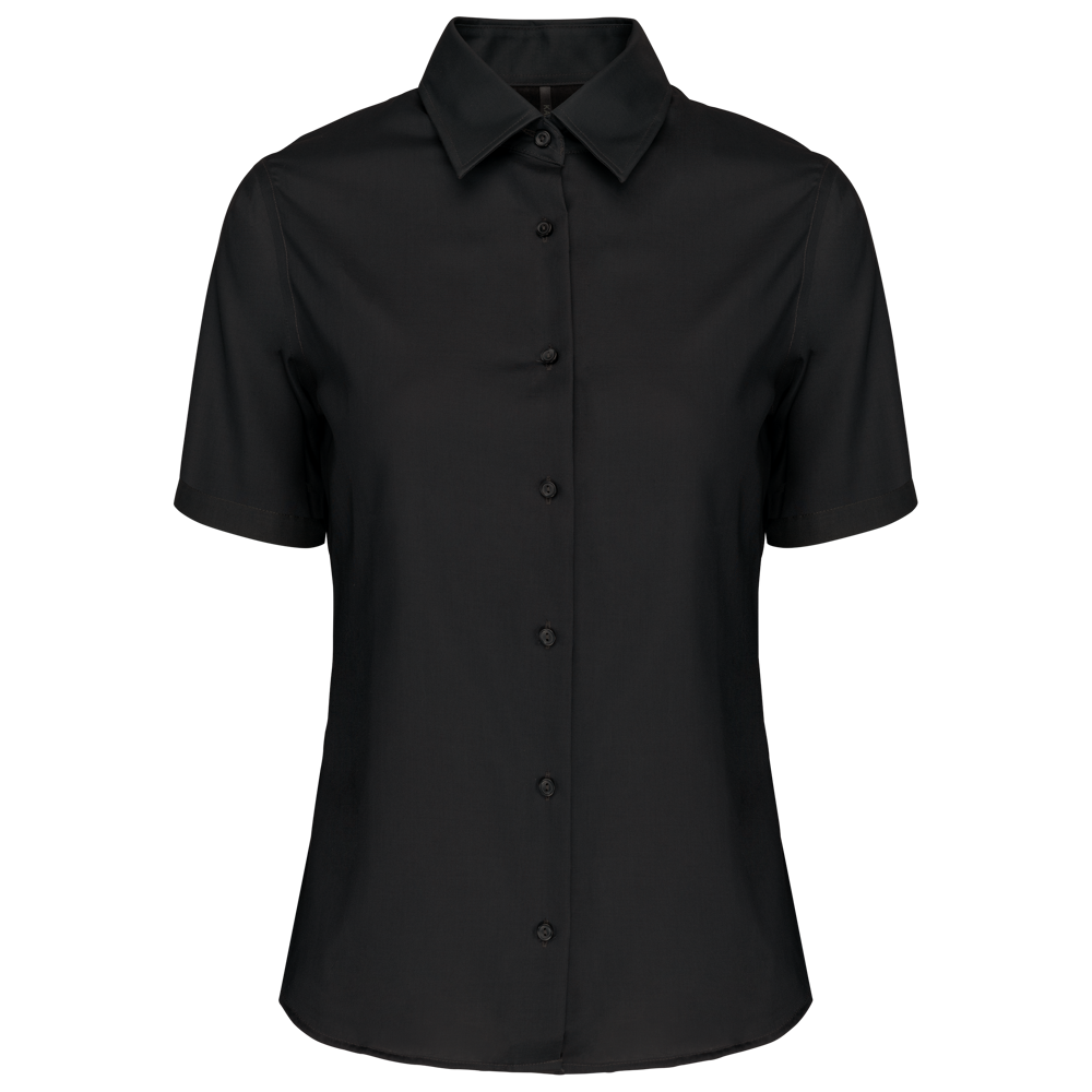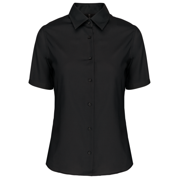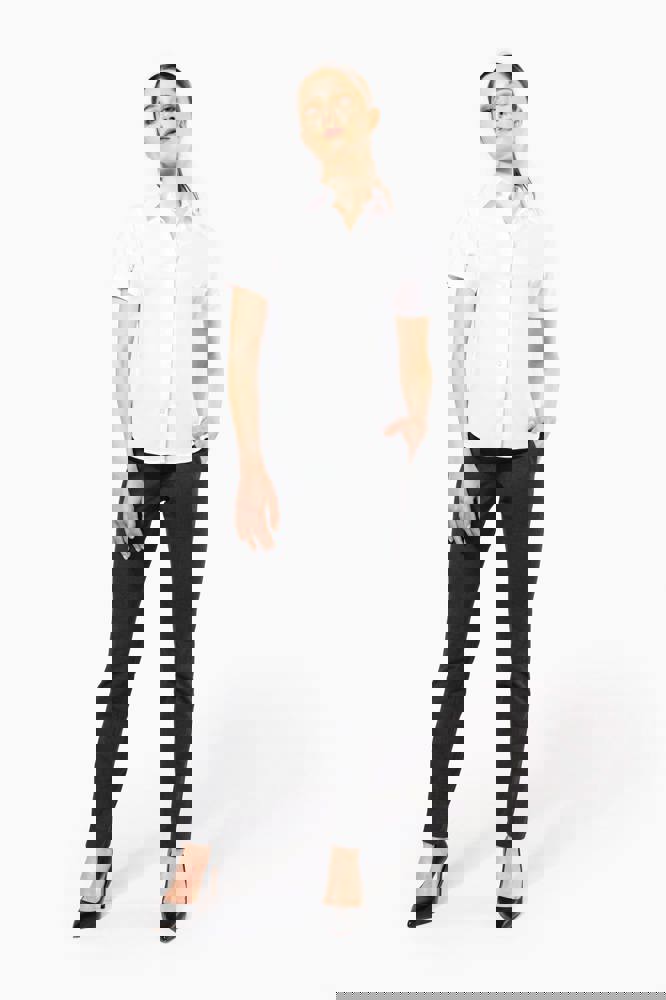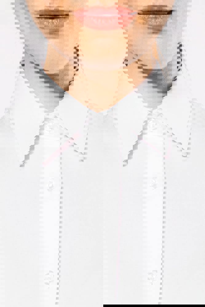 100% Baumwolle Micro Twill. Bügelfreie Bluse. Klassischer, knopfloser Kragen. Farblich abgestimmte Knöpfe. Nahtloser Saum an der Knopfleiste. 1 Ersatzknopf. Abgerundeter Saum.