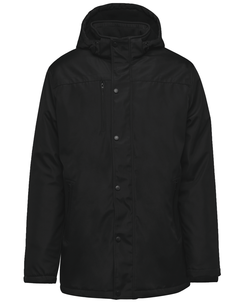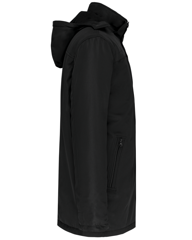 Außenmaterial: 100 % Polyester-Pongé 230 g/m². Wattiertes Innenfutter 100 % Polyester 135 g/m². Zwei Innenmaterialien: Mikrofleece 180 g/m² im Brustbereich und gestepptes 210T 60 g/m² Polyesterfutter im unteren Bereich des Kleidungsstücks. Satiniertes und weiches Außenmaterial. 2 Seitentaschen und 1 Brusttasche mit Reißverschlüssen. 2 Innentaschen. Krageninnenseite gerippt, Kapuze fleecegefüttert und abnehmbar. Zwei-Wege-Reißverschluss mit Blende. Ärmel mit versteckten Rippenbündchen. Zweifarbiges Zierband im Inneren. 1 Reißverschluss an der Brusttasche links und 1 Reißverschluss am Saum zur Veredelung.