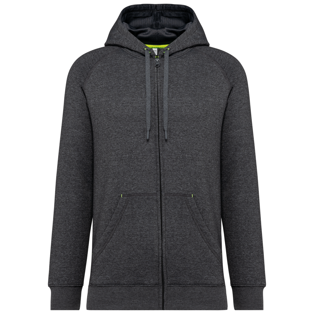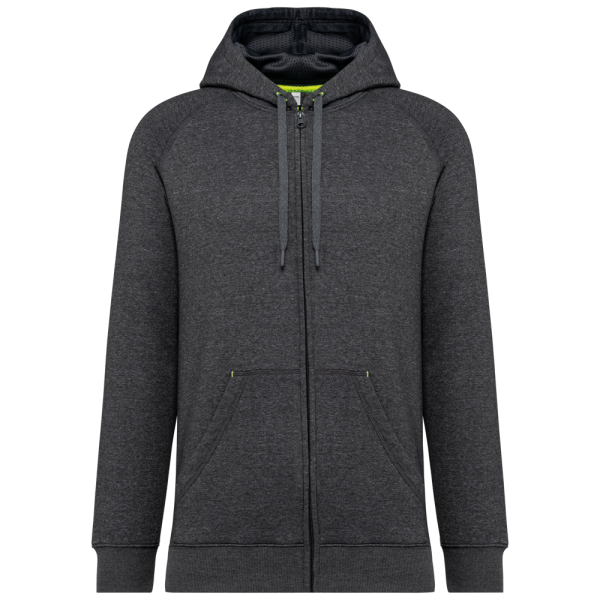 65 % Polyester/35 % Baumwolle. Vortex-Faden. Gebürsteter Molton. Gekämmte Baumwolle. Gerader Schnitt. Raglanärmel. Nylon-Reißverschluss. Gefütterte Kapuze aus Ton-in-Ton-Netzstoff. Kängurutaschen mit fluoreszierender Handytasche. Nackenband auf der Innenseite der Kapuze, Ösen der Kordel der Kapuze und Vertiefungen in fluoreszierenden Farben auf den Taschen. 2 x 2 doppelte Rippstrickbündchen an den Ärmeln und am unteren Saum. Halbmondförmiger Halsausschnitt auf der Rückseite für eine einfache Markenveredelung auf der Innenseite. Markenetikett zum Abreißen.