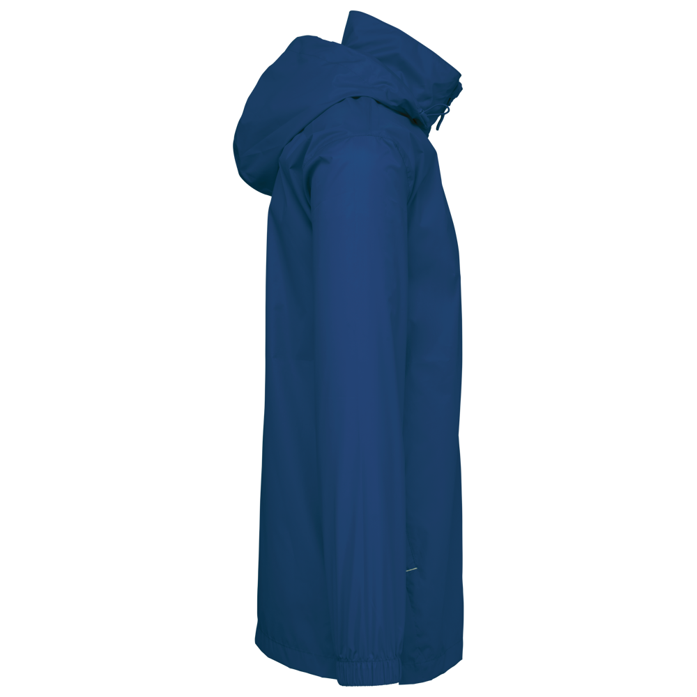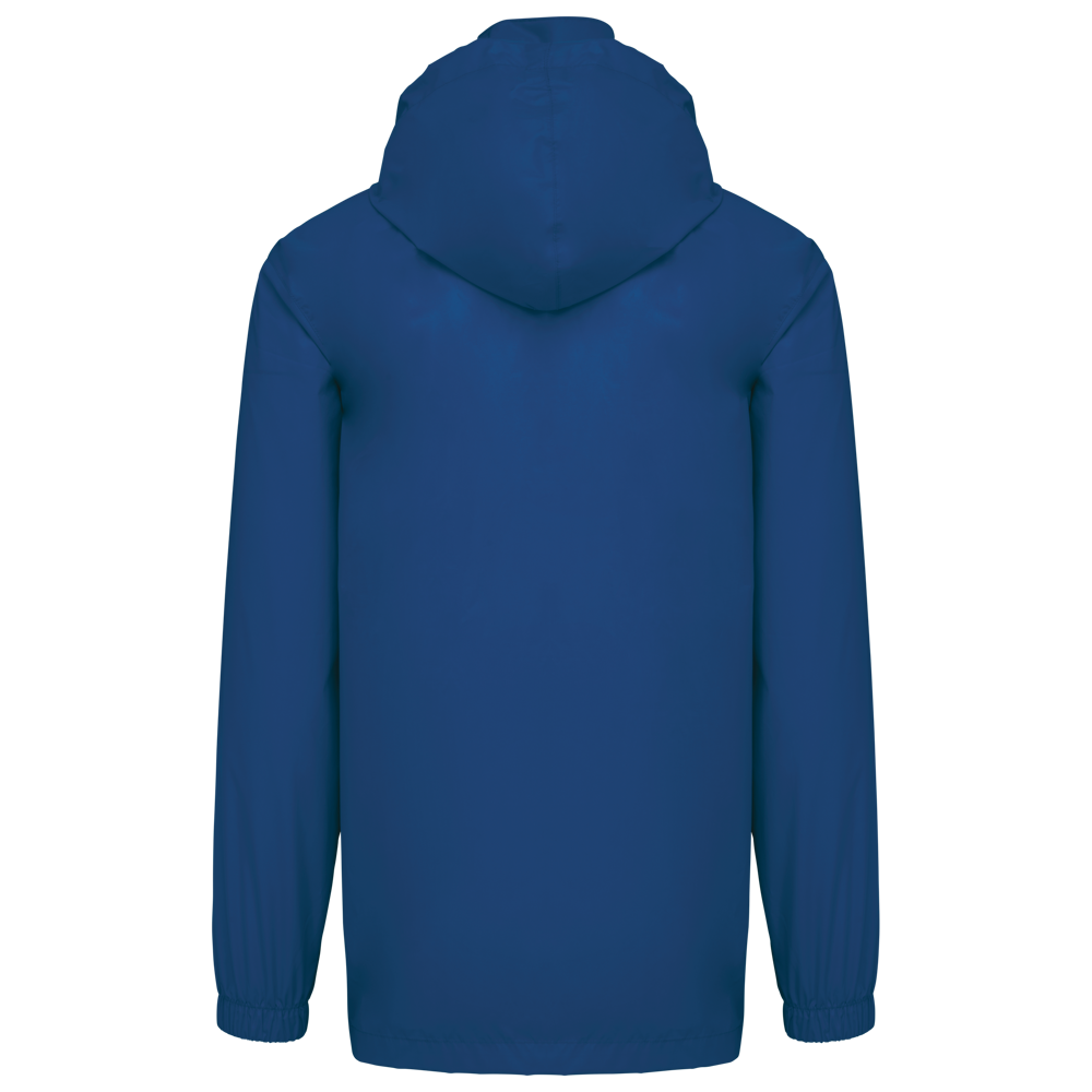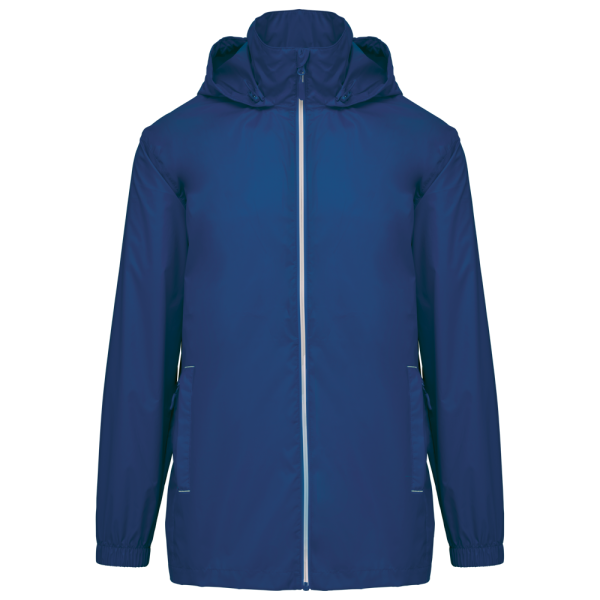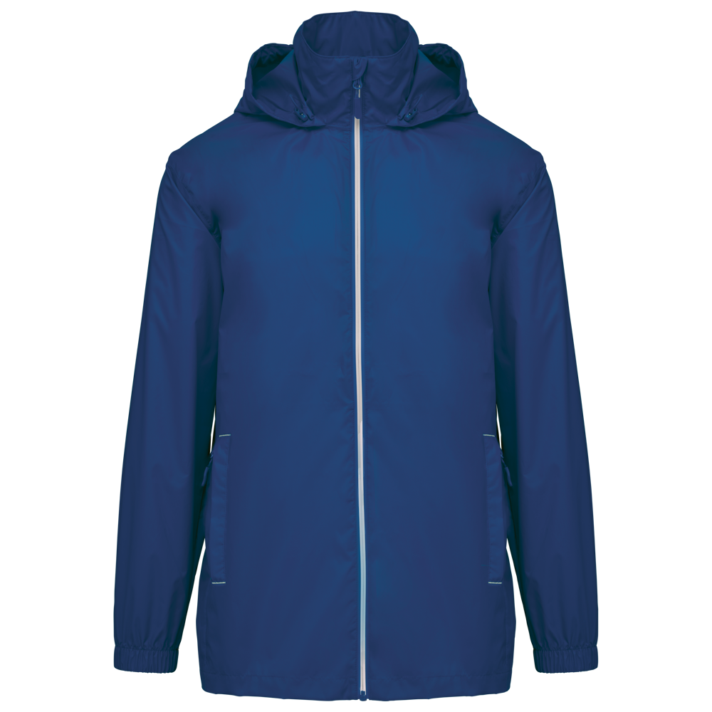 100% mattes 210T PU-beschichtetes Polyester. Wasserdichtes Gewebe 1500 mm. Wasserdichte, verschweißte Schulternähte und Kapuze. 2 seitliche Reißverschlusstaschen und Reißverschlussanhänger. 2 Innentaschen. Frontverschluss mit kontrastfarbenem Reißverschluss. Verstellbare Kapuze mit Stoppern im Kragen mit Klettverschlussleiste. Elastische Manschetten. Abnehmbares Markenetikett.