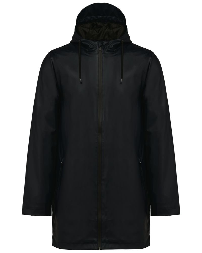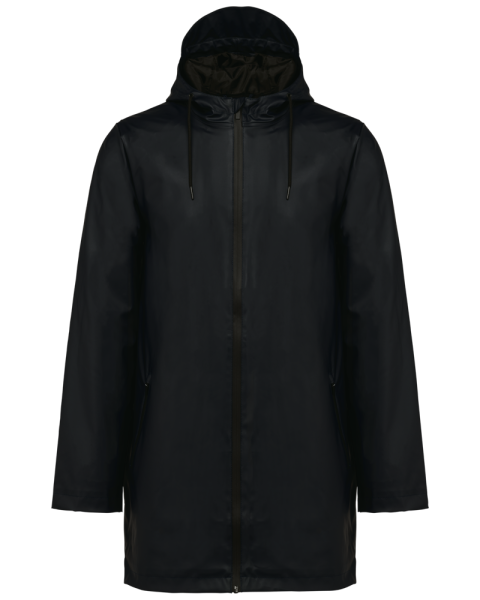 100 % Polyurethan-Beschichtung auf der Außensite und 100 % Polyester auf der Innenseite. Wärmeverschweißte Nähte. Vollständig wasserdicht bei 5.000 mm. Futter aus 100 % Polyester. Kapuze mit Schutzvisier und Kordelzug, Stopper mit Metallkappe. Reißverschluss mit wasserdichter Abdeckung, der bis zur Kapuze reicht, mit Zipper-Abdeckung oben. 2 Seitentaschen mit vollständig wasserdichtem Reißverschluss und Zipper-Abdeckung. Belüftungsösen unter der Achsel. Längeres Rückenteil mit Dehnfalte am Saum. Schlaufe auf der Innenseite des Halsausschnitts zum Aufhängen der Jacke. Patch zur Veredelung auf der Innenseite oben am Rücken. Reißverschluss zur Veredelung innen, hinten am Saum und auf der Brusttasche. Kein Markenetikett, nur Größenkennzeichnung um die Veredelung zur erleichtern.