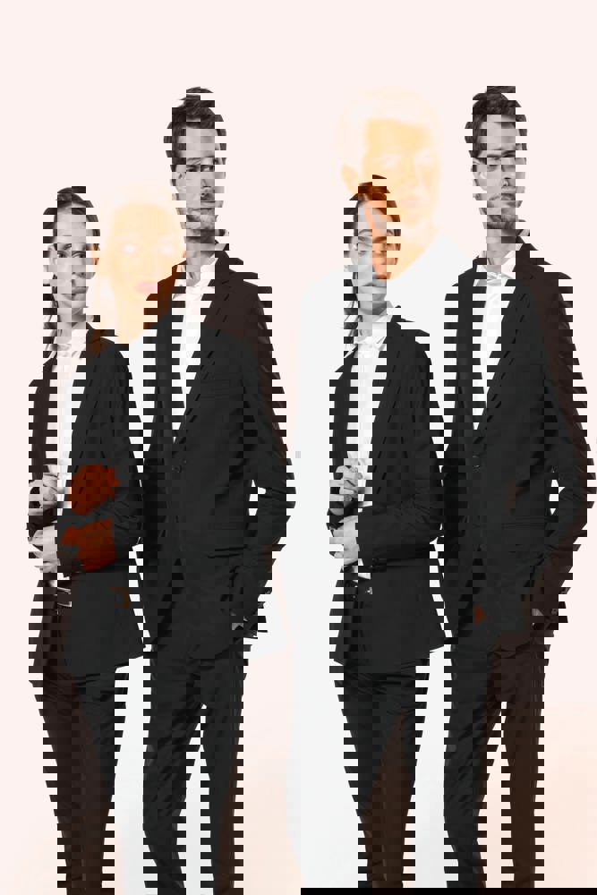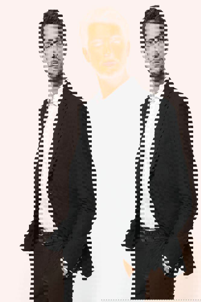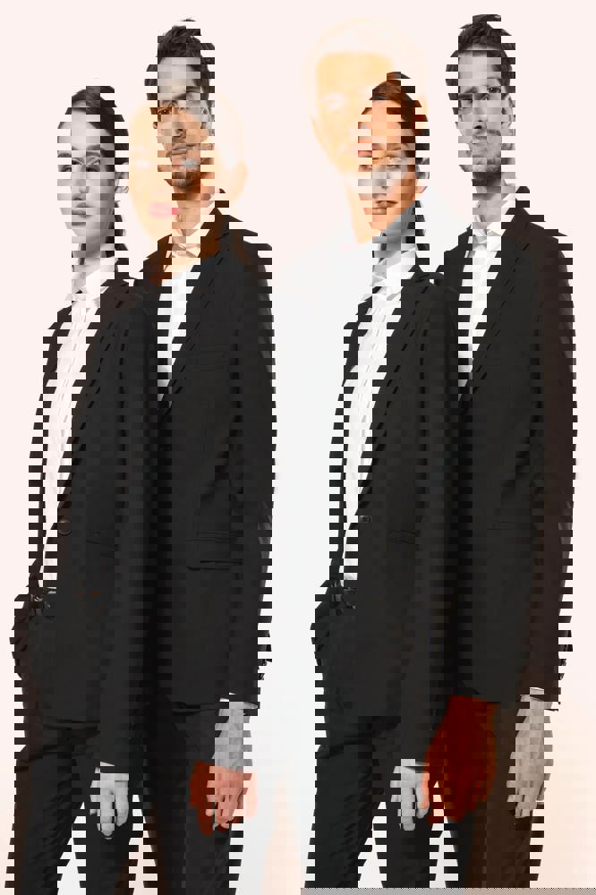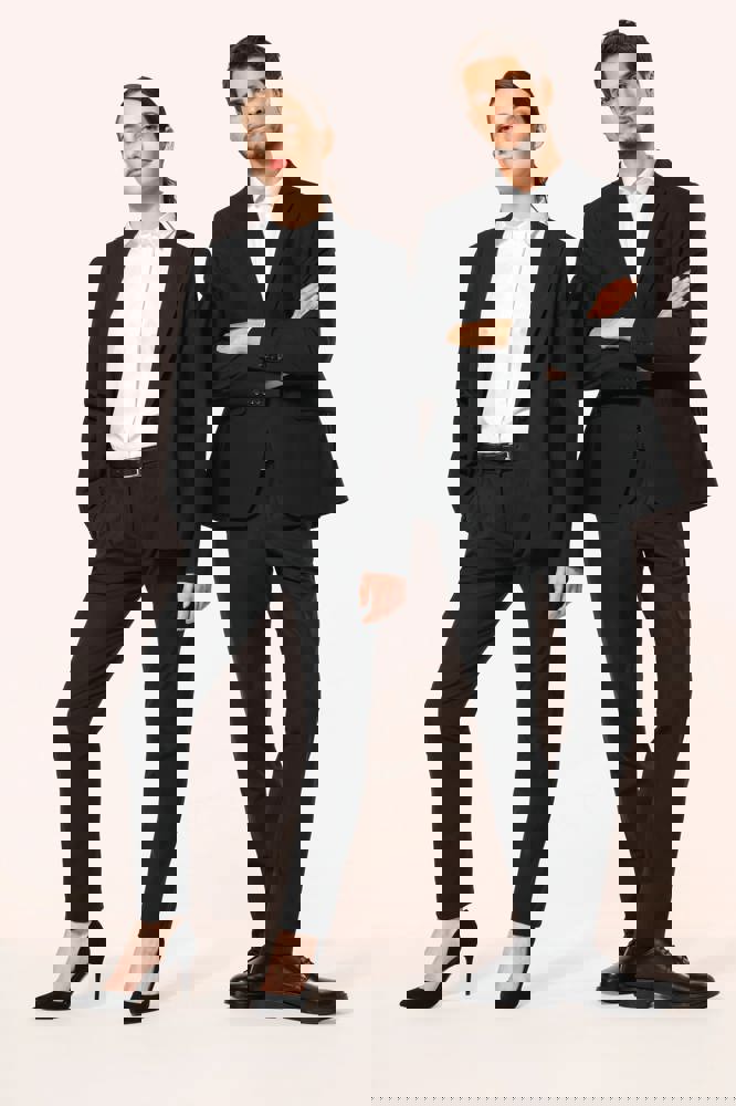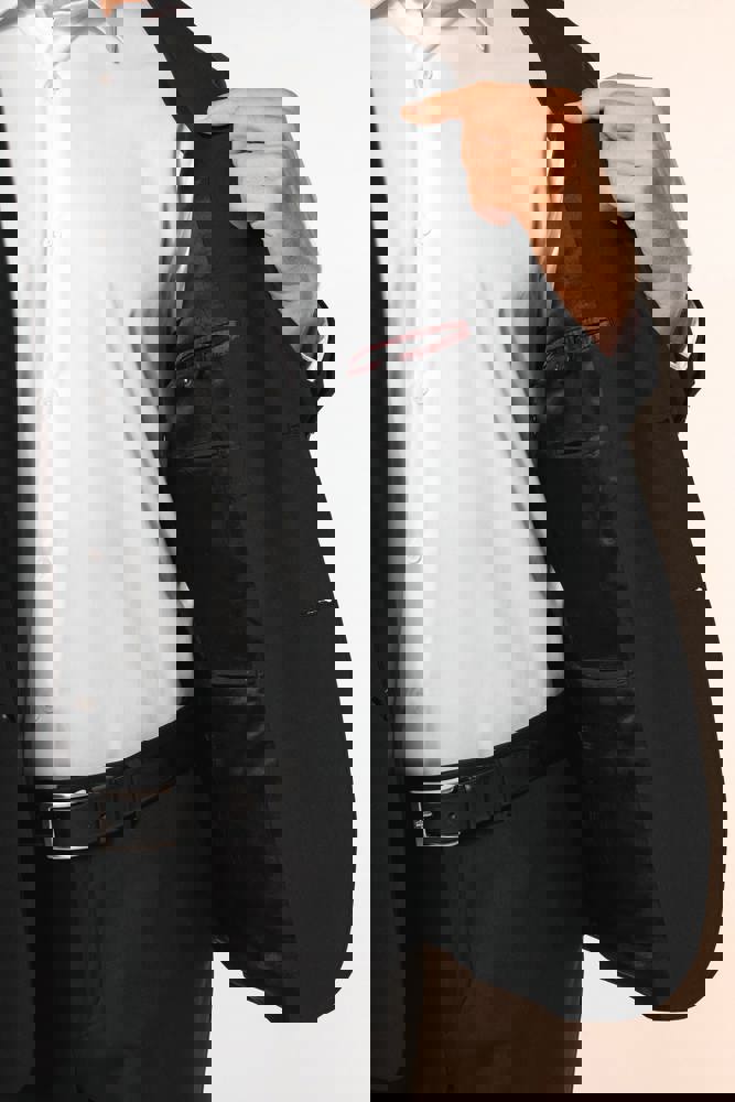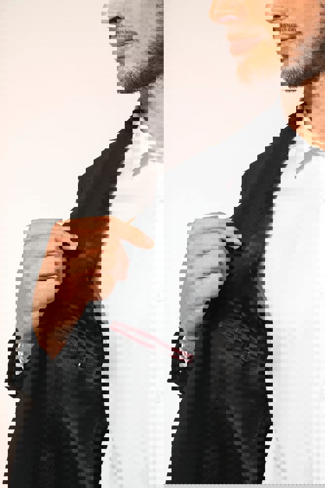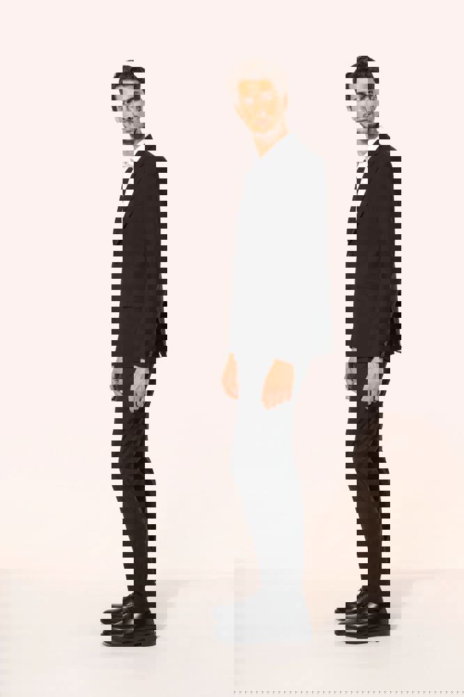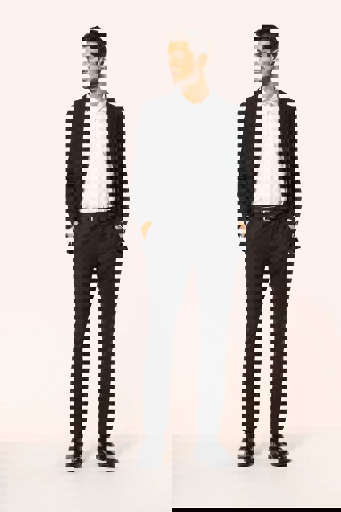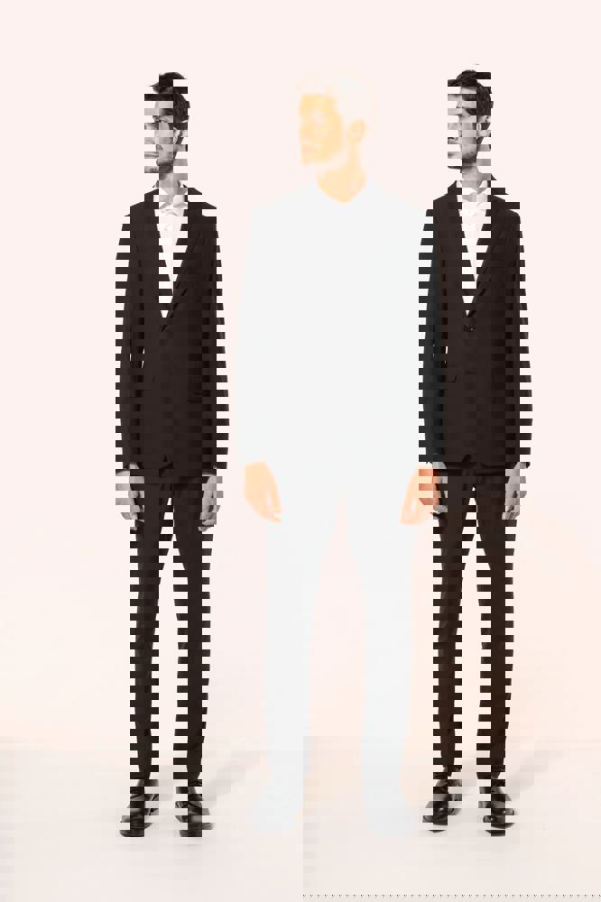 50 % Polyester / 23 % Viskose / 22 % Wolle / 5 % Elasthan. Ton-in-Ton-Futter aus Twill (100 % Polyester). Gerader Schnitt. Jacke mit zwei Ton-in-Ton-Knöpfen. Zwei paspelierte Taschen mit Patten sowie eine paspelierte Brusttasche auf der linken Seite. Falsche Knopfleiste (Ton-in-Ton) auf dem Revers des Kragens. Seitlicher Einsatz zur Formgebung. Lasche aus Satin am Halsausschnitt. Naht in Rückenmitte und zwei Schlitze am unteren Saum. Ärmelbündchen mit falschem Schlitz mit 4 Ton-in-Ton-Knöpfen. Finish mit kontrastfarbenem Schrägband an den beiden inneren Brusttaschen. Paspelierte Handytasche und Tickettasche (Ton-in-Ton) innen auf der linken Seite. Veredelbarer Reißverschluss auf der linken Seite. Kein Markenetikett, nur Größenangabe, zur einfacheren Veredelung.
