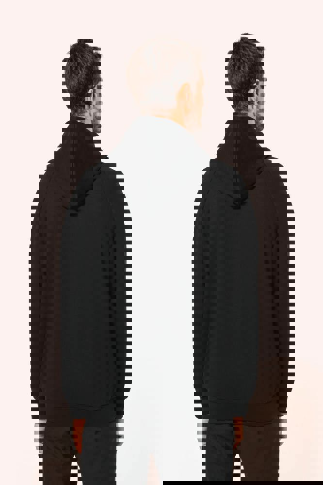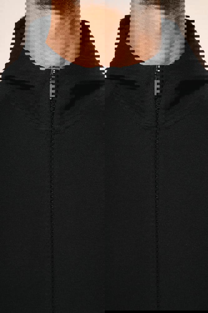 70 % Baumwolle / 26 % Polyester / 4 % Elasthan. Gekämmte Baumwolle. Interlock-Stoff. LSI-Behandlung (Low Shrinkage Interlock). Kapuze mit 2 Panels und stoffgleichem Futter, kein Kordelzug. Ziernähte am Kragen. Nackenband auf der Innenseite des Halsausschnitts. Farblich abgestimmter Nylon-Reißverschluss mit Metall und Nackenband auf der Innenseite. Raglanärmel. 1x1 Rippstrick. 2 Taschen in der Einsatznaht. Kein Markenetikett, nur Größenkennzeichnung für eine leichtere Veredelung.