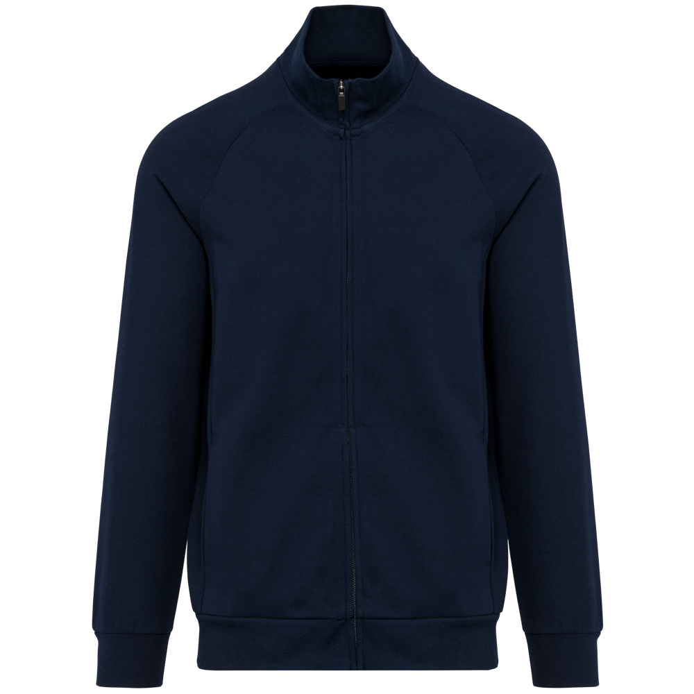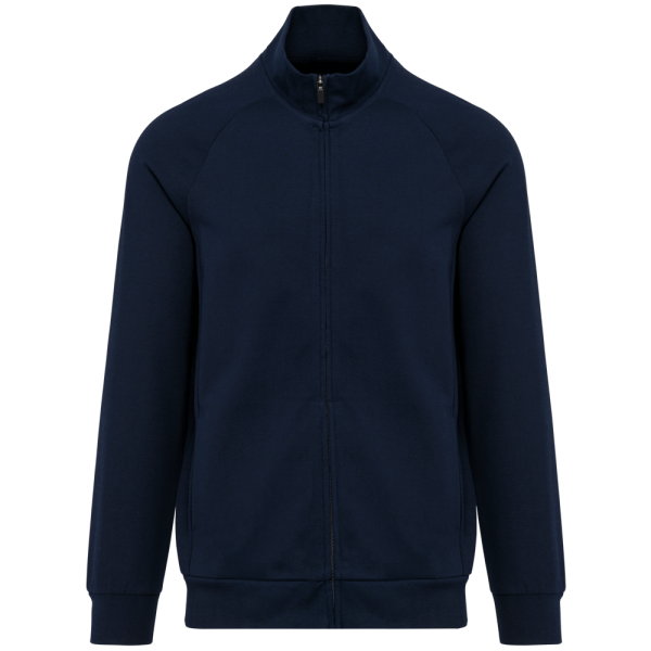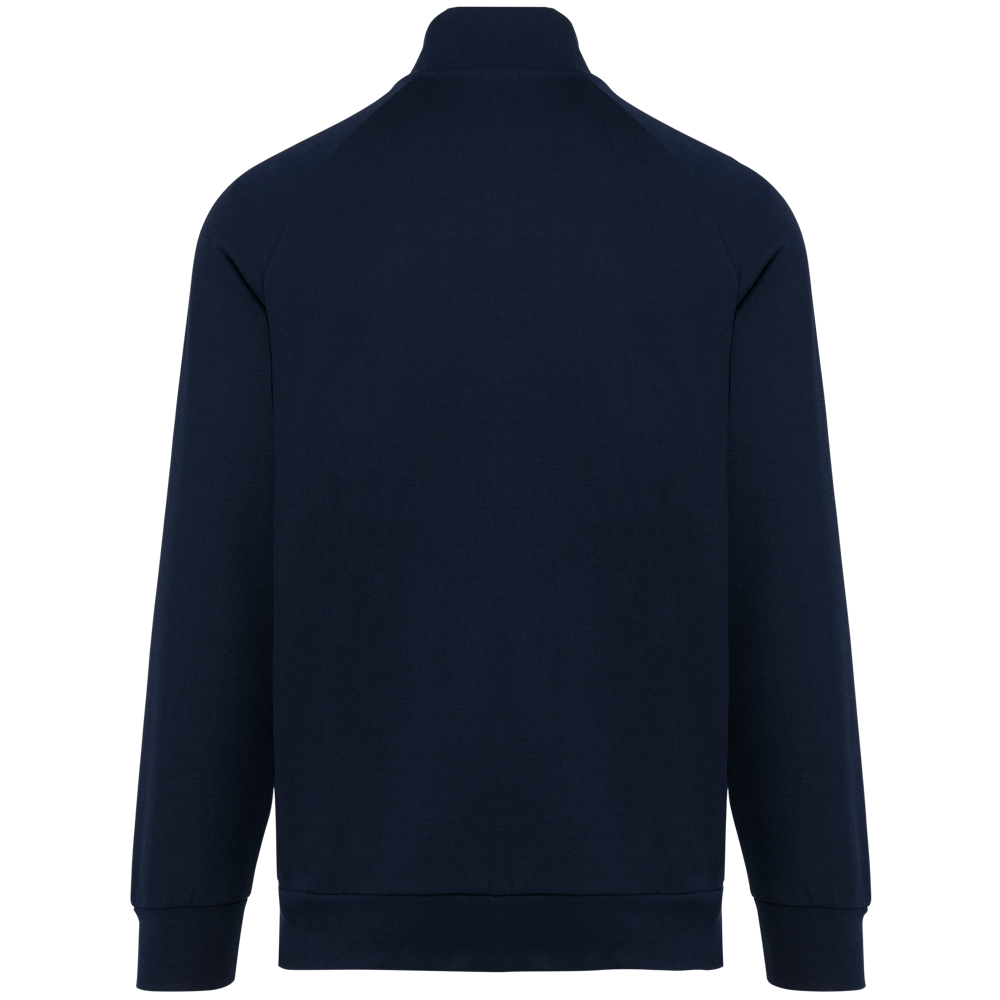 70 % Baumwolle / 26 % Polyester / 4 % Elasthan. Gekämmte Baumwolle. Interlock-Stoff. LSI-Behandlung (Low Shrinkage Interlock). Ziernähte am Kragen. Nackenband auf der Innenseite des Halsausschnitts. Farblich abgestimmter Nylon-Reißverschluss mit Metall und Nackenband auf der Innenseite. Raglanärmel. 1x1 Rippstrick. 2 Taschen in der Einsatznaht. Kein Markenetikett, nur Größenkennzeichnung für eine leichtere Veredelung.