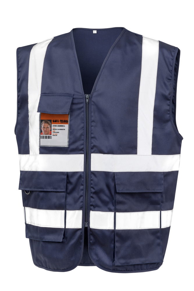 Sicherheitsweste mit reflektierenden Bändern und 50 mm an Rumpf und Schultern. Seitentaschen mit unterschiedlichen Tiefen und Klettverschluss. Eingefasster Ton-in-Ton-Saum. Brusttasche mit Tasche für Zugangsbadge. Reißverschluss vorn. EN ISO 13688:2013. Fluorescent Yellow und Fluorescent Orange : EN ISO 2013+A1 :2016 Class 2. Black und Navy : EN17353:2020 (Typ B3 Nur für den Nachtgebrauch)