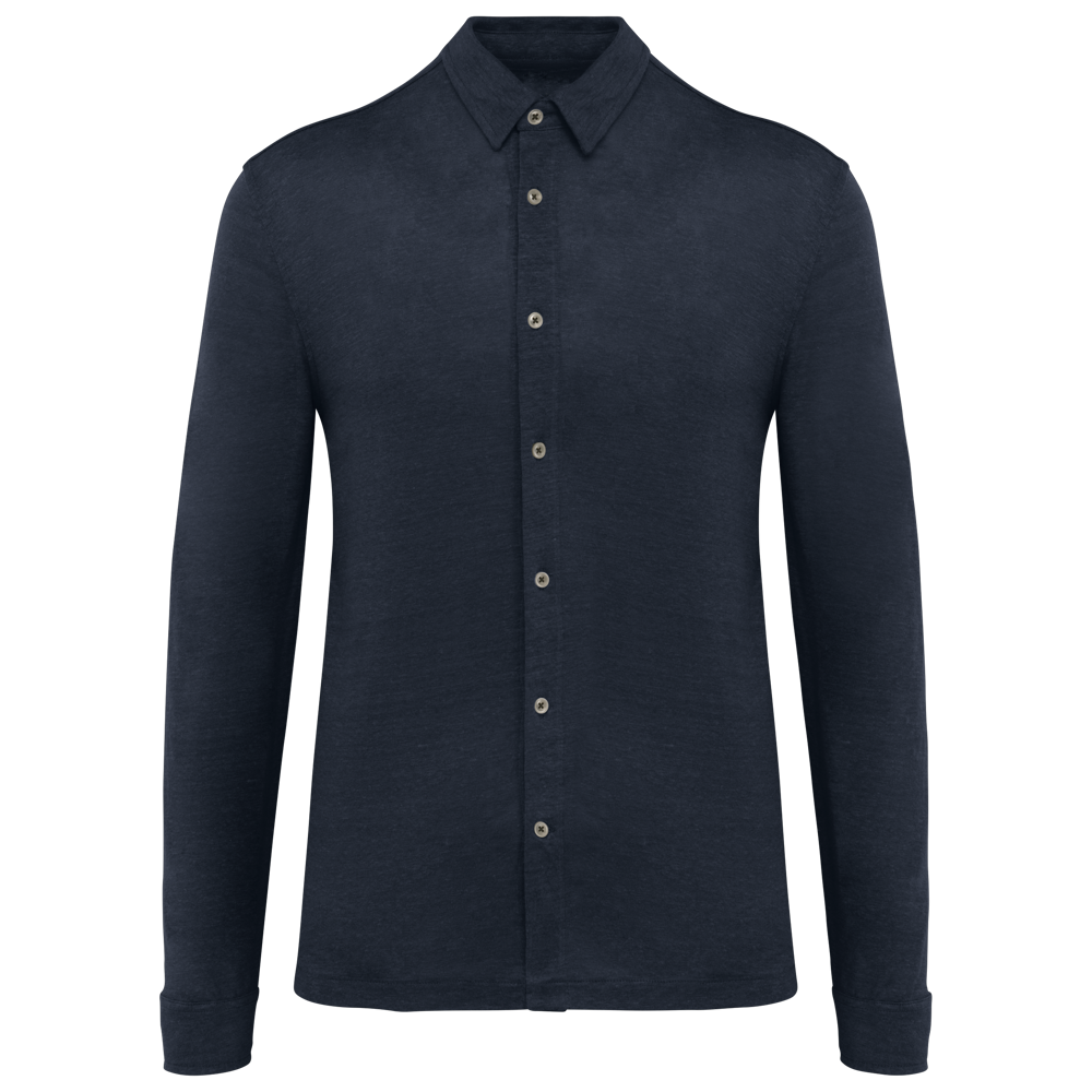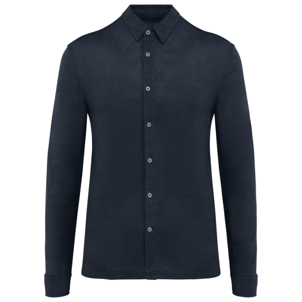 100% Leinen. Strick. Gerader Schnitt. Kragen mit Kragensteg. Rückenpasse. Geknöpfte Manschette mit Schlitz. Knopfleiste mit kontrastierenden Knöpfen aus recyceltem Kunststoff mit Perlmutt-Optik bei allen Farben. Einfache Ziernaht am Saum.