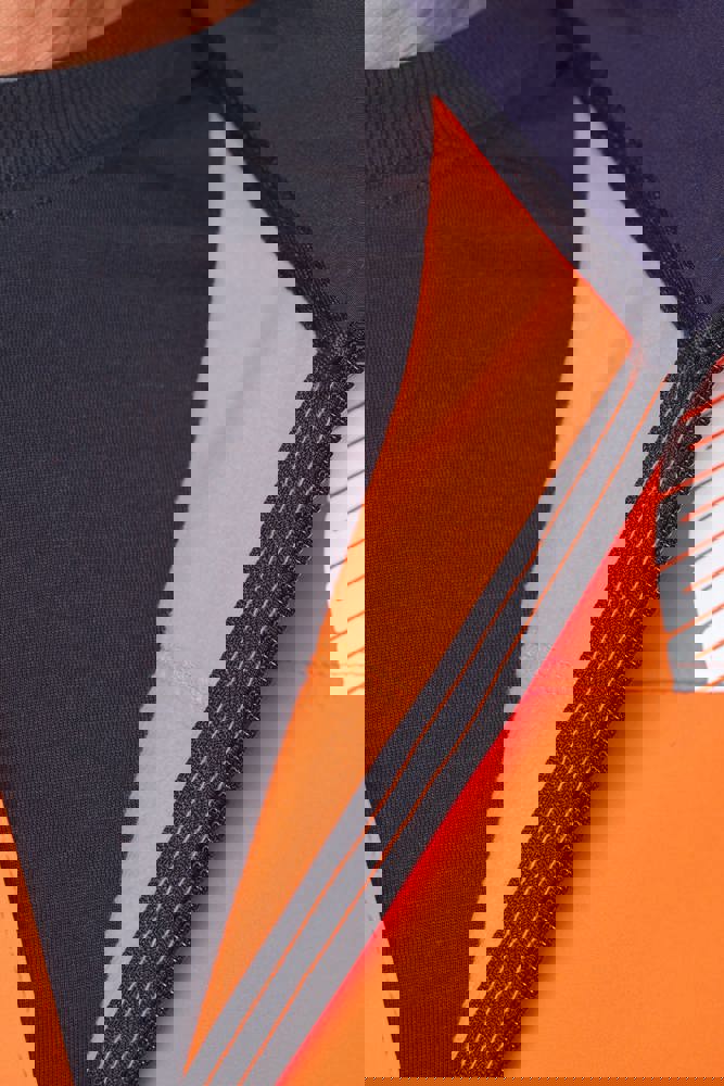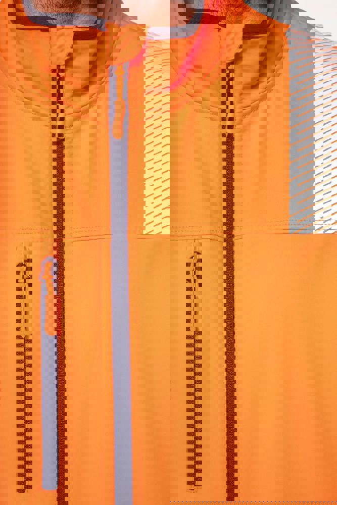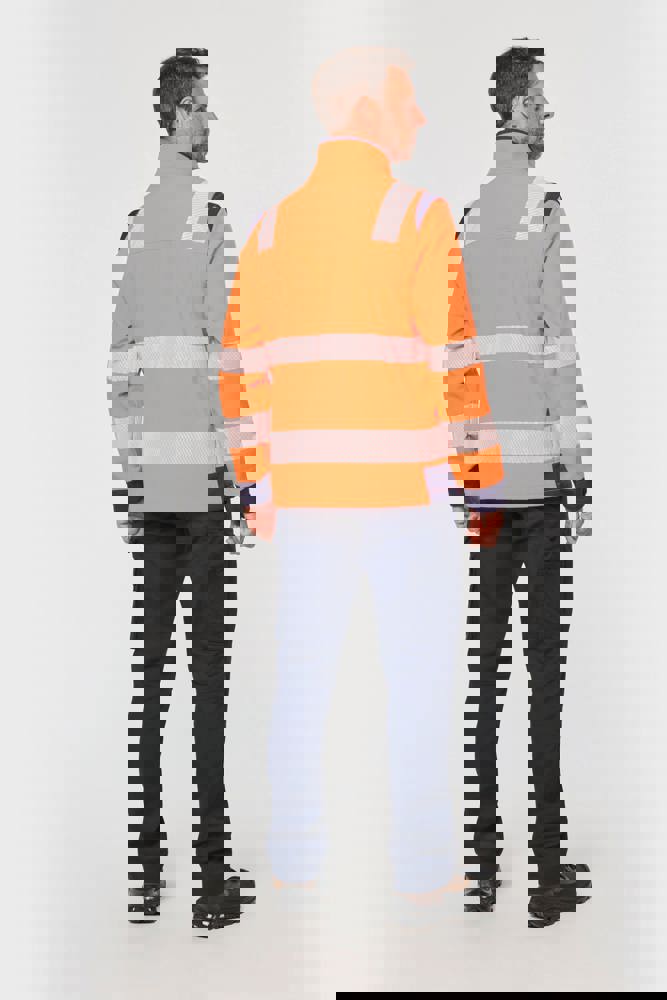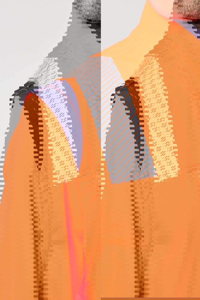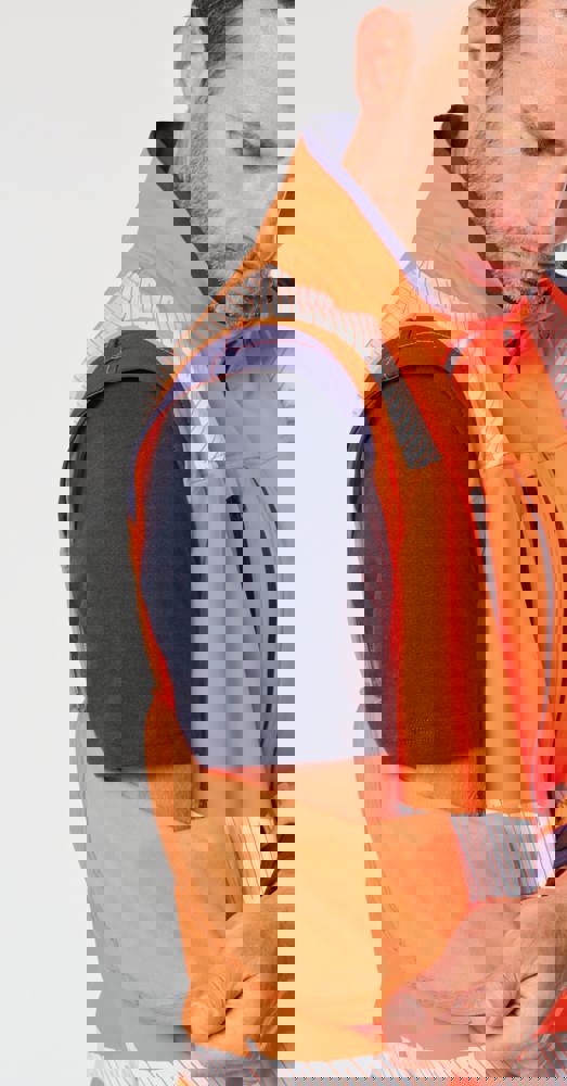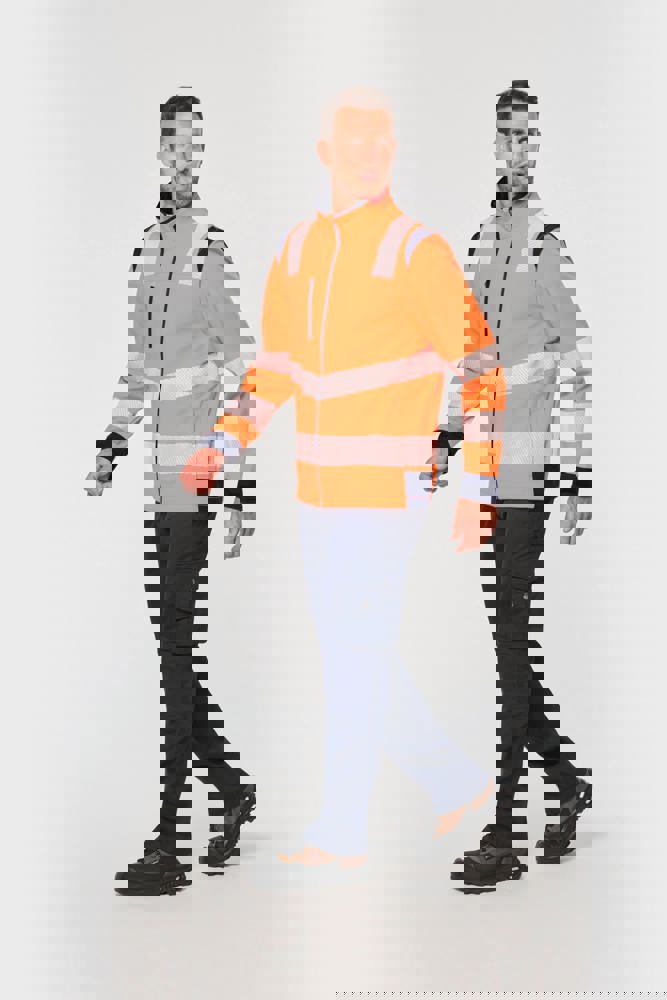 94 % recycelter Polyester/6 % Elasthan. 3-lagiges Verbundgewebe, atmungsaktiv 3000g/m²/24h und wasserdicht 5000mm. Außenschicht: 94 % recycelter Polyester/6 % Elasthan. Zwischenlage: atmungsaktive und wasserdichte Membran. Innenschicht: 100 % Mikrofleece aus recyceltem Polyester. Waschen 40°C (25 Zyklen). Nylon-Reißverschluss mit Kinnschutz und Reißverschlusszieher. 1 vertikale Brusttasche mit Reißverschluss auf der rechten Seite beim Tragen. 2 seitliche Reißverschlusstaschen. 2 Innentaschen. Ärmel mit Klettverschluss verstellbar. Abnehmbare Ärmel mit Reißverschluss. Saum mit Kordelzug verstellbar. Kontrastfarbene Einsätze an Schultern, Ärmeln und Seiten. Innenseite des Kragens und des Nackenbandes in Kontrastfarben. Befestigungshaken auf der Krageninnenseite. 5,5 cm breite, retroreflektierende Segmentstreifen an Schultern, Unterbrust und Ärmeln. Segmentierte, retroreflektierende 7 cm breite Streifen am unteren Kleidungsteil und den Ärmelabschlüssen. EPI Klasse II. Normen NF EN ISO 13688:2013 + NF EN ISO 13688/A1:2021 (Schutzkleidung - Allgemeine Anforderungen), NF EN ISO 20471:2013 + NF EN ISO 20471/A1:2017: Kleidungsstück mit Ärmeln: Klasse 2 für Größe XS und S - Klasse 3 von Größe M bis 6XL, Kleidung ohne Ärmel: Klasse 1 für Größe XS und S - Klasse 2 von Größe M bis 6XL (Hochsichtbare Warnkleidung - Prüfverfahren und Anforderungen), RIS-3279-TOM Issue 2:2019 nur für die Farbe Hi Viz Orange/Navy (Standard für die Eisenbahnindustrie). Abtrennbares Marken-Label.