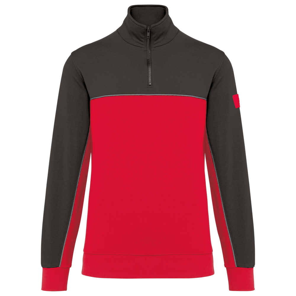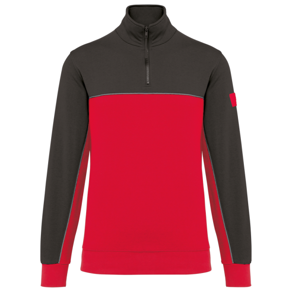 60 % Baumwolle / 40 % recyceltem Polyester. Gebürsteter Molton mit 3 Nähten und LSF-Behandlung (Low Shrinkage Fleece). Gerader Schnitt. Set-in-Ärmel. Ausschnitt mit Kunststoff-Reißverschluss und recyceltem, farblich abgestimmtem Reißverschlussanhänger. Kontrastfarbenes Nackenband mit Fischgrätmuster auf der Innenseite. Halbmondförmiger Halsausschnitt auf der Rückseite für eine einfache Markenveredelung auf der Innenseite. Kontrastfarbene Paspel zwischen den zweifarbigen Elementen des Kleidungsstücks (Rumpf und Ärmel auf Vorderseite und Rücken). 1x1-Strickbündchen an Ärmeln und Saum. Elastische Stifthalterung mit 3 Fächern am linken Ärmel des Trägers. Markenetikett zum Abreißen.