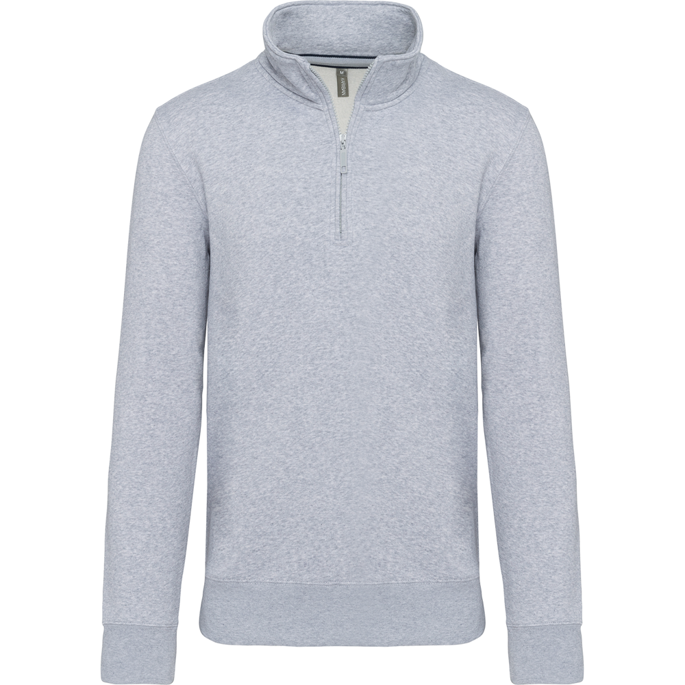 80 % Baumwolle / 20 % Polyester (Ash Heather : 79% Baumwolle / 20% Polyester / 1% Viskose). Außenseiteaus 100% Baumwolle. LSF-Behandlung (Low Shrinkage Fleece: vorgeschrumpftes Fleece). Gebürstetes Fleece mit drei Fäden aus gekämmter Baumwolle. Set-in-Ärmel. Kragen mit farblich abgestimmtem Kunststoff-Reißverschluss. Nackenband in Kontrastfarbe am Kragen (Heather Grey für alle Farben, Navy für Oxford-Grey und Ash Heather). Strickbündchen an Ärmeln und Saum.