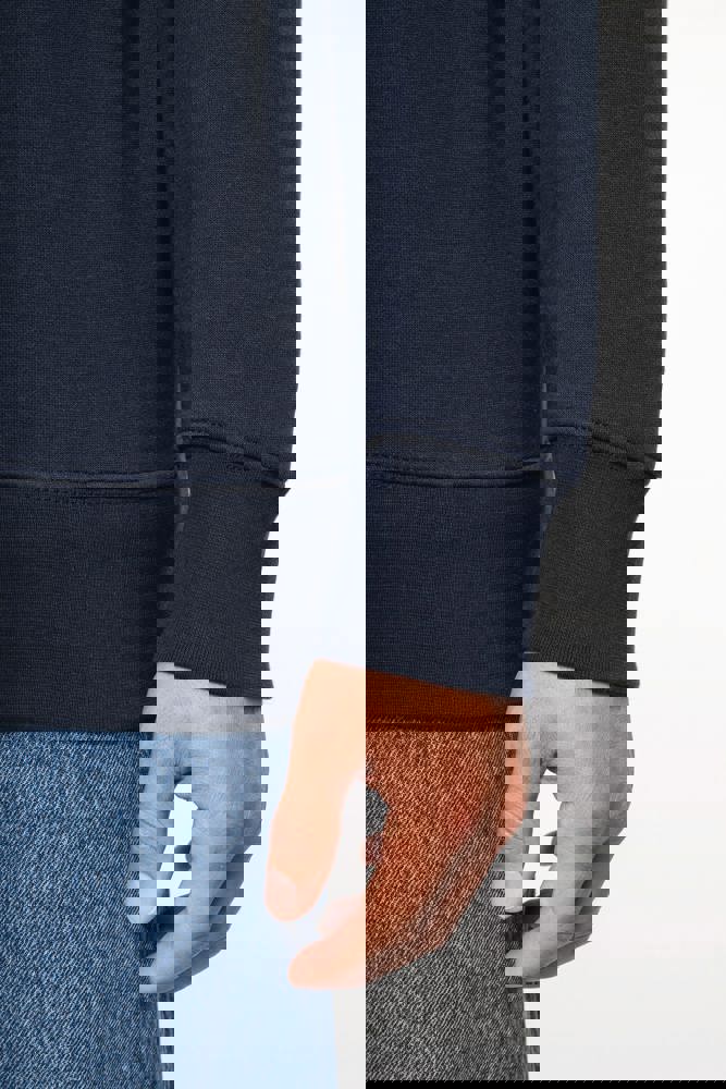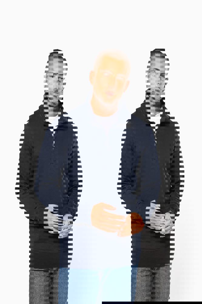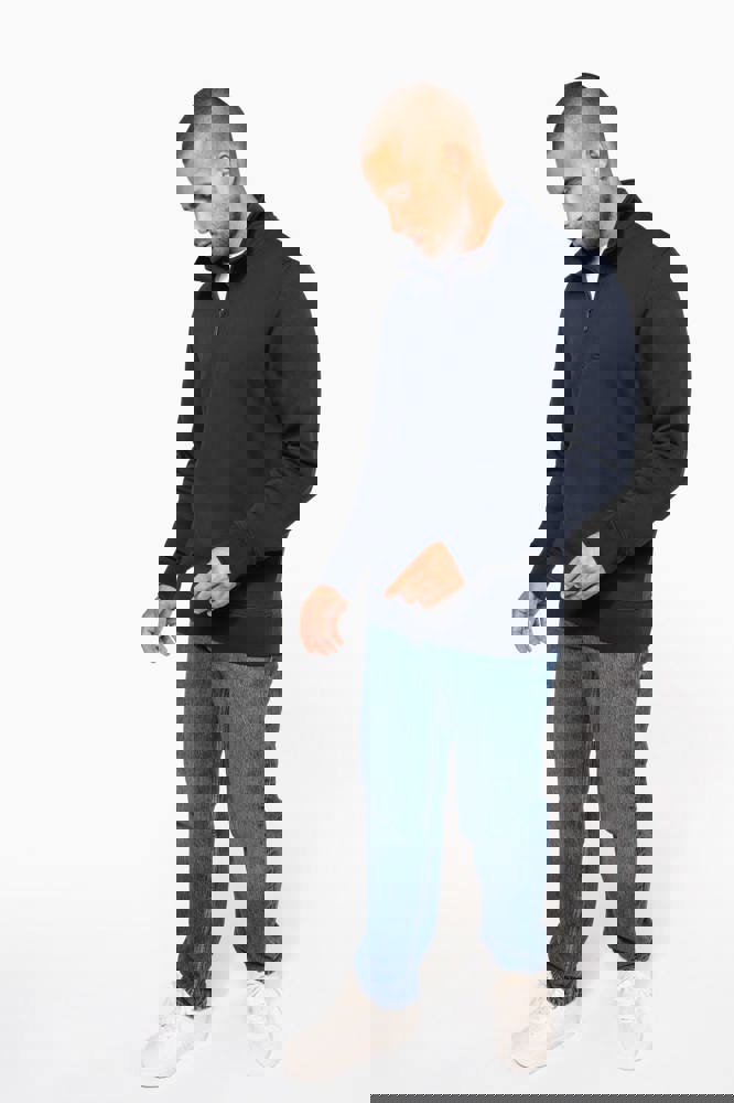80 % Baumwolle / 20 % Polyester (Ash Heather : 79% Baumwolle / 20% Polyester / 1% Viskose). Außenseiteaus 100% Baumwolle. LSF-Behandlung (Low Shrinkage Fleece: vorgeschrumpftes Fleece). Gebürstetes Fleece mit drei Fäden aus gekämmter Baumwolle. Set-in-Ärmel. Kragen mit farblich abgestimmtem Kunststoff-Reißverschluss. Nackenband in Kontrastfarbe am Kragen (Heather Grey für alle Farben, Navy für Oxford-Grey und Ash Heather). Strickbündchen an Ärmeln und Saum.
