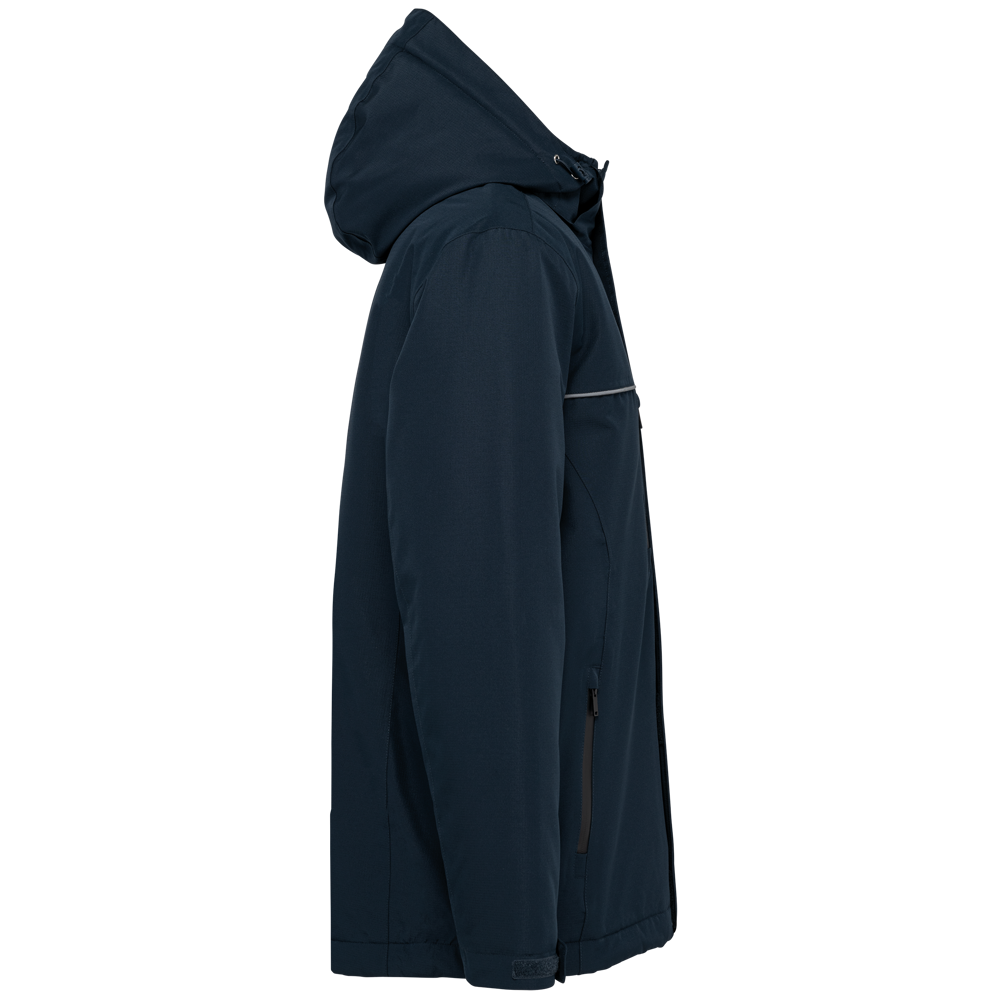 100 % Polyester. 2-lagiger Ripstop-Verbundstoff mit atmungsaktiver TPU-Membran 3000 g/m²/24 Std. Wasserabweisende Behandlung und wasserdicht verschweißte Nähte. Waschbar bei 40 °C. Oberer Körperbereich mit Fleece gefüttert. Unterer Körperbereich und Ärmel mit gestepptem Polyester 300T gefüttert. Wattierung: 100 % Polyester. Reißverschluss mit Kinnschutz, verborgen unter einer Windschutzleiste mit Klettverschlüssen. 2 Seitentaschen und 1 Brusttasche mit wasserdichten Reißverschlüssen. Kontrastpaspel auf Brusthöhe. Ärmelbündchen mit Klettverschlüssen verstellbar. Abnehmbare, gefütterte Kapuze mit elastischem Kordelzug und Stoppern. 1 Innentasche auf der rechten Brustseite mit Klettverschluss. 2 Reißverschlüsse zur Personalisierung innen: 1 auf Herzhöhe, 1 am unteren Rücken. Innere Aufhängeschlaufe am oberen Rücken. Saum mit elastischem Kordelzug und Stoppern verstellbar. PSA Kategorie I. Entspricht EN ISO 13688:2013+A1:2021 „Schutzkleidung – Allgemeine Anforderungen“ und EN 343:2019 „Schutzkleidung – Schutz gegen Regen“: Klasse 3 / Klasse 1 / X. Abtrennbares Markenetikett.