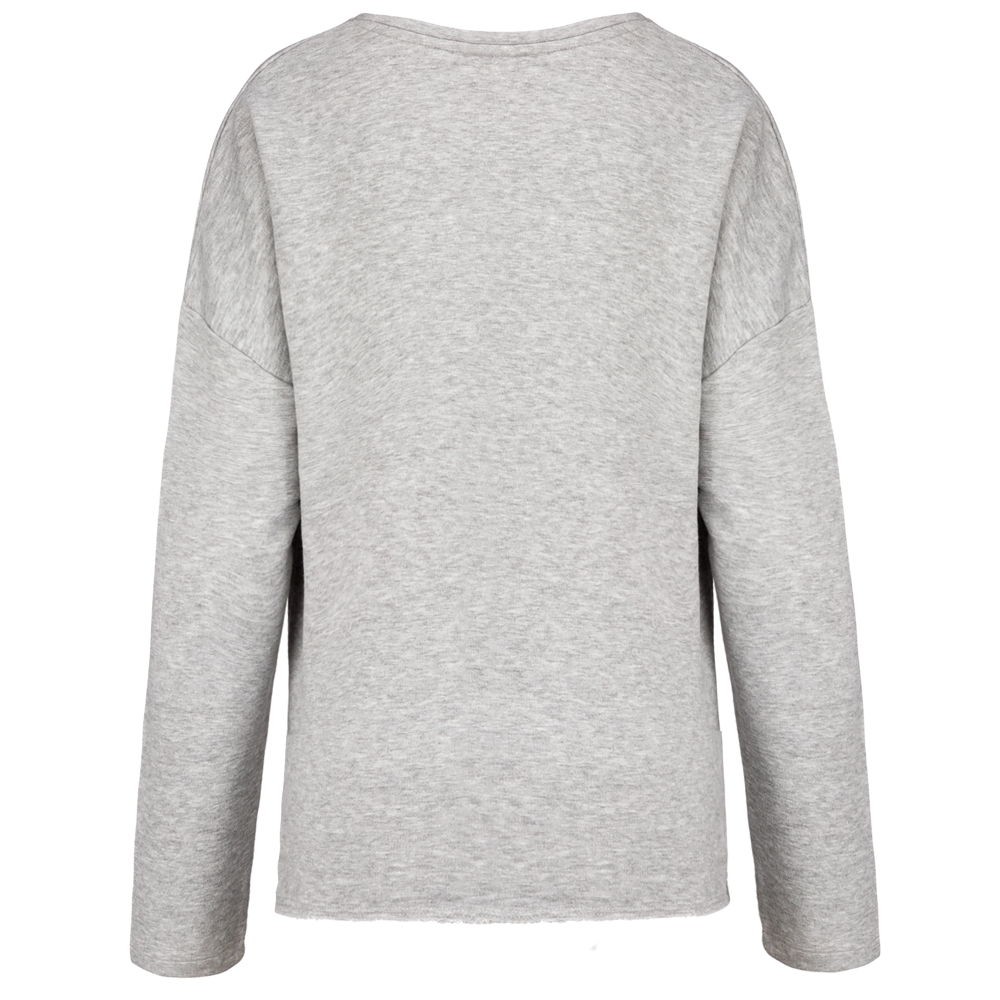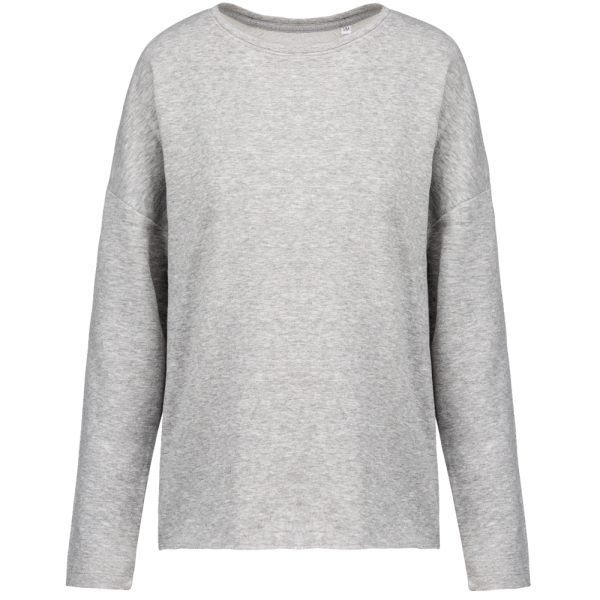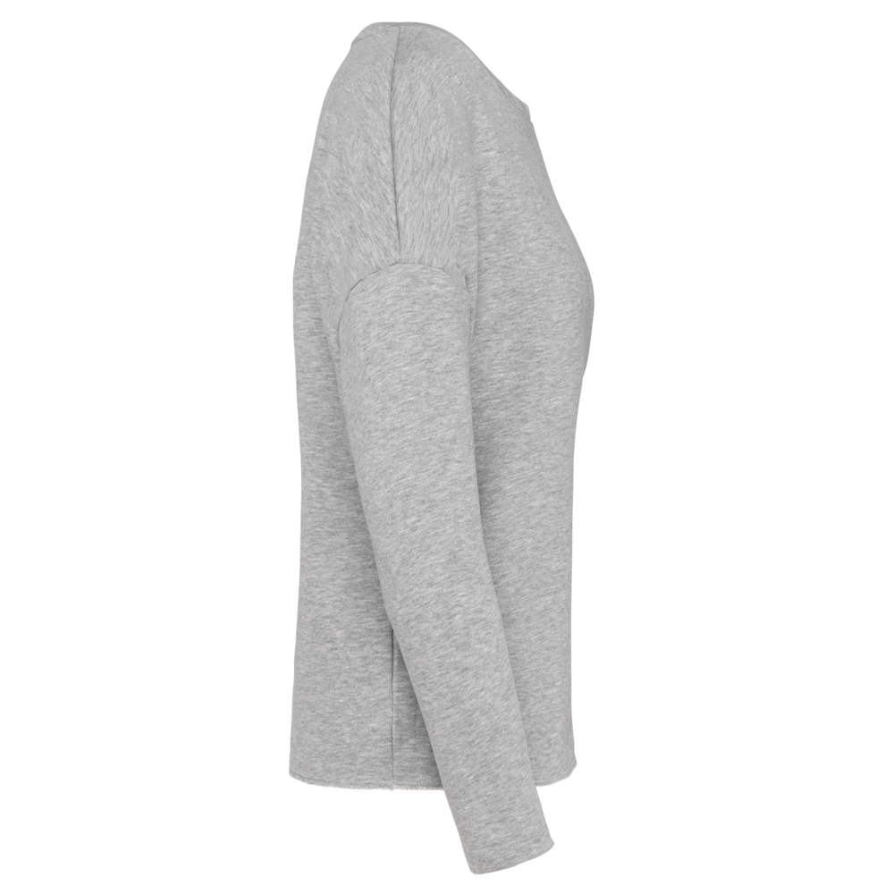 91 % Baumwolle / 9 % Polyester (Light Grey Heather: 87 % Baumwolle / 9 % Polyester / 4 % Viskose). Ungebürstetes Fleece „French Terry". Sehr weiche Textur. Lockere Passform mit großem Halsausschnitt. Fischgrätnackenband. Ungesäumter Abschluss unten. Doppelnähte am Ärmelbündchen.