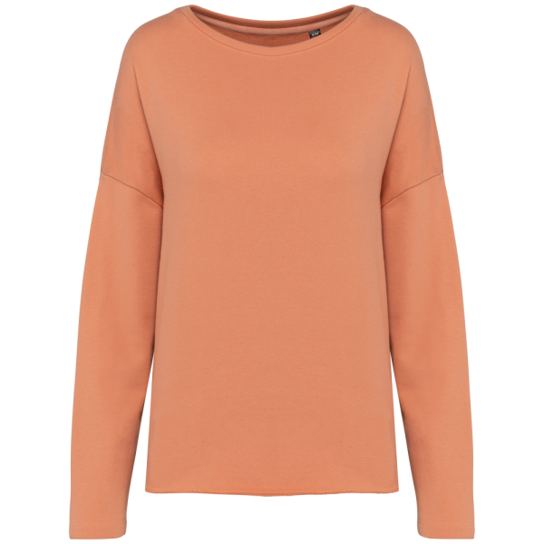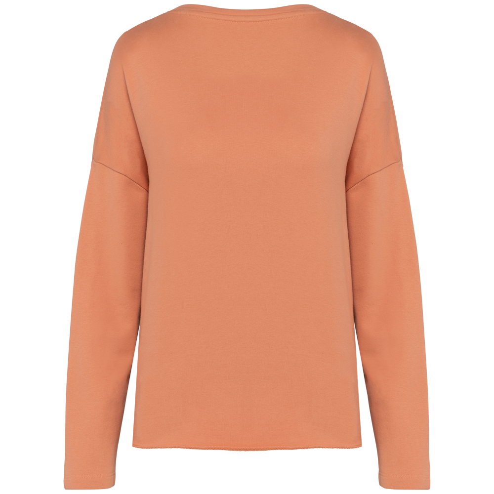 91 % Baumwolle / 9 % Polyester (Light Grey Heather: 87 % Baumwolle / 9 % Polyester / 4 % Viskose). Ungebürstetes Fleece „French Terry". Sehr weiche Textur. Lockere Passform mit großem Halsausschnitt. Fischgrätnackenband. Ungesäumter Abschluss unten. Doppelnähte am Ärmelbündchen.