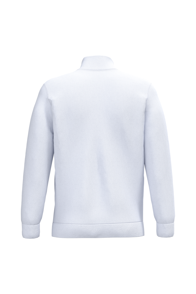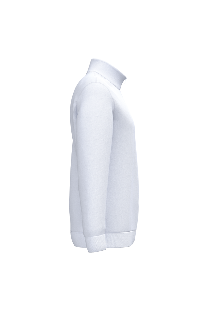 80 % Baumwolle / 20 % Polyester. Gekämmte Baumwolle. Gebürstetes Fleece. Set-in-Ärmel. Reißverschluss am Kragen und Nackenband. Saum und Ärmelbündchen in Rippstrick.