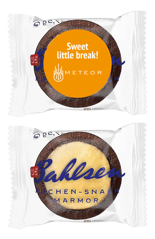 Mini-Marmorkuchen der Marke Bahlsen, original verpackt mit individuell bedrucktem, runden Etikett. mehr