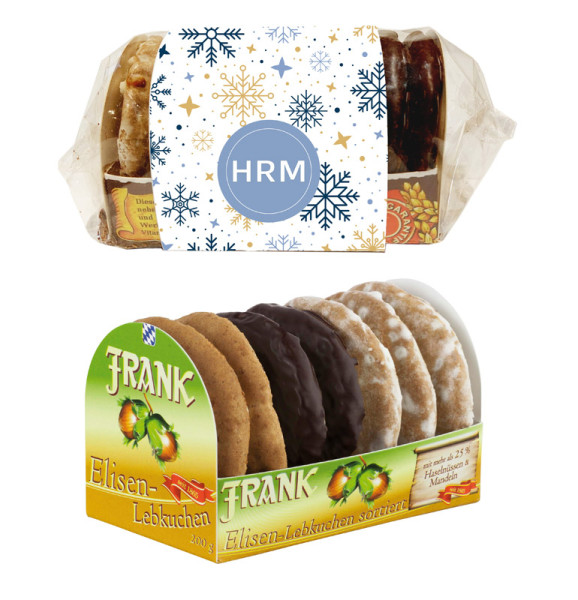 Sieben runde Elisen-Lebkuchen der Marke Frank, originalverpackt im Tray mit individuell bedruckter Banderole – erhältlich in fünf verschiedenen Ausführungen.