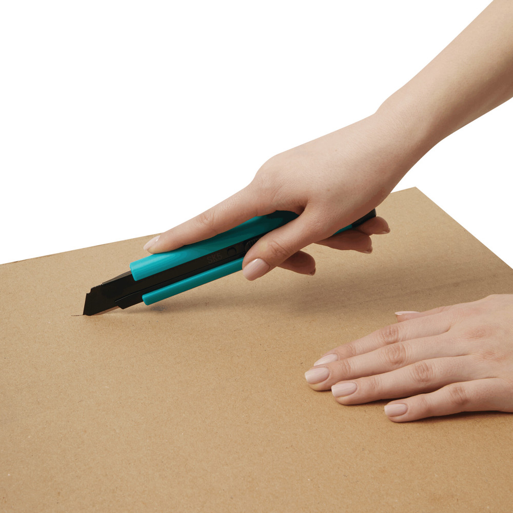 Cuttermesser RELIABLE: mit beweglicher, schwarzer 18 mm Abbrechklinge (10 Klingenabschnitte und 2 Ersatzklingen), Klingenvorschub mit Gleiter und Auto-Stopp, Kunststoffgehäuse, Klingenführung aus Stahl, für leichte bis schwere Schneidearbeiten, in Box