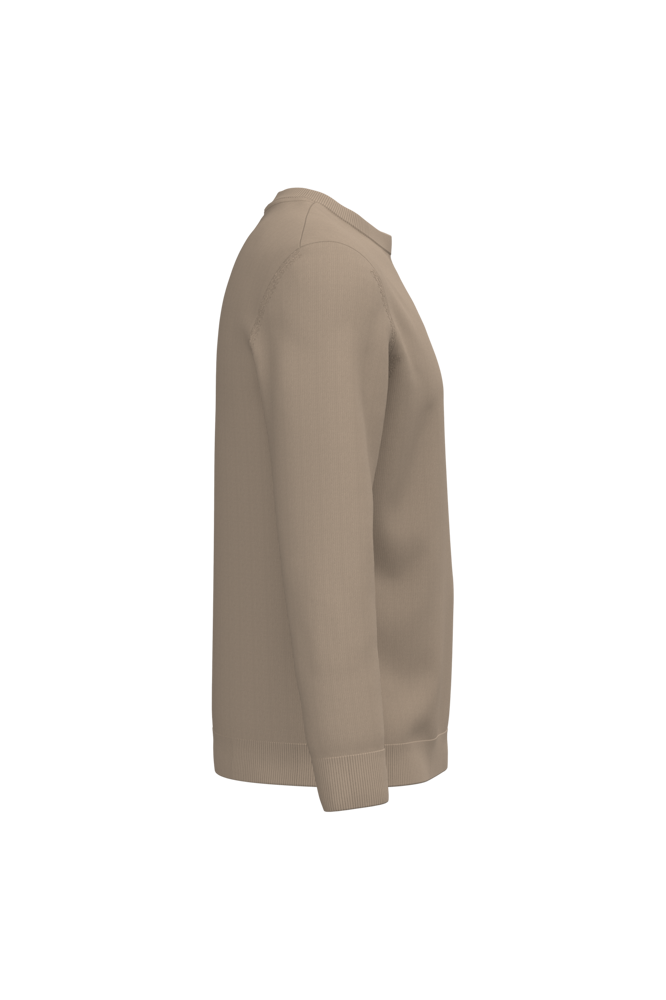 100 % Bio-Baumwolle. Gekämmte Baumwolle. 12 gg Strick. Gerader Schnitt. 1 x 1-Rippstrick am Kragen, am Saum und an den Ärmelenden. Formstrick „Fully Fashion“. Anti-Pilling-Behandlung. Innenseite des Kragens mit einem Nackenband aus tonalem Hauptmaterial. Durchschnittliches Gewicht bei Größe L: 270 g.