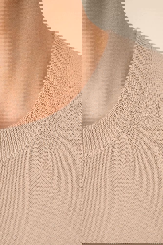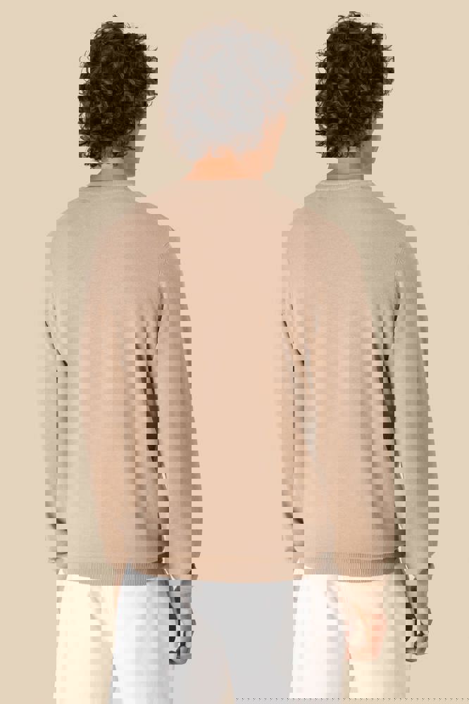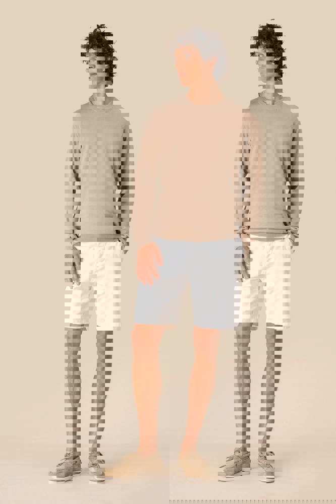 100 % Bio-Baumwolle. Gekämmte Baumwolle. 12 gg Strick. Gerader Schnitt. 1 x 1-Rippstrick am Kragen, am Saum und an den Ärmelenden. Formstrick „Fully Fashion“. Anti-Pilling-Behandlung. Innenseite des Kragens mit einem Nackenband aus tonalem Hauptmaterial. Durchschnittliches Gewicht bei Größe L: 270 g.