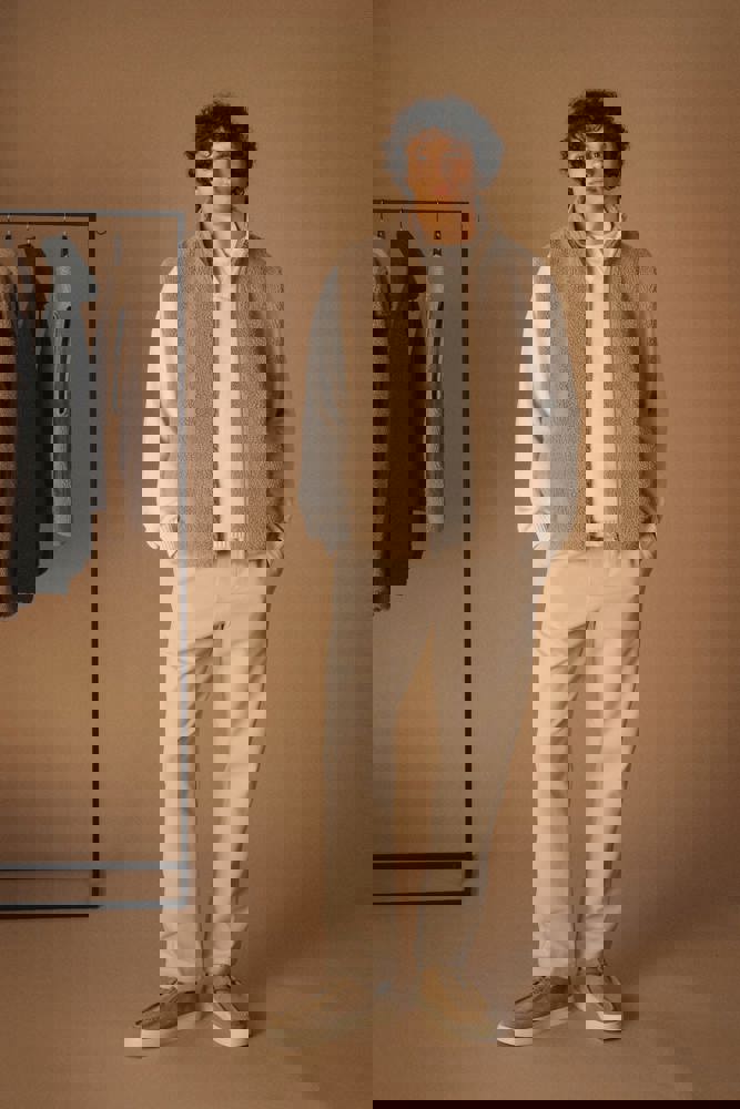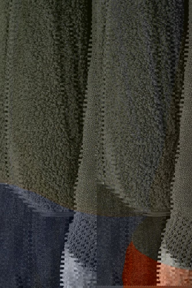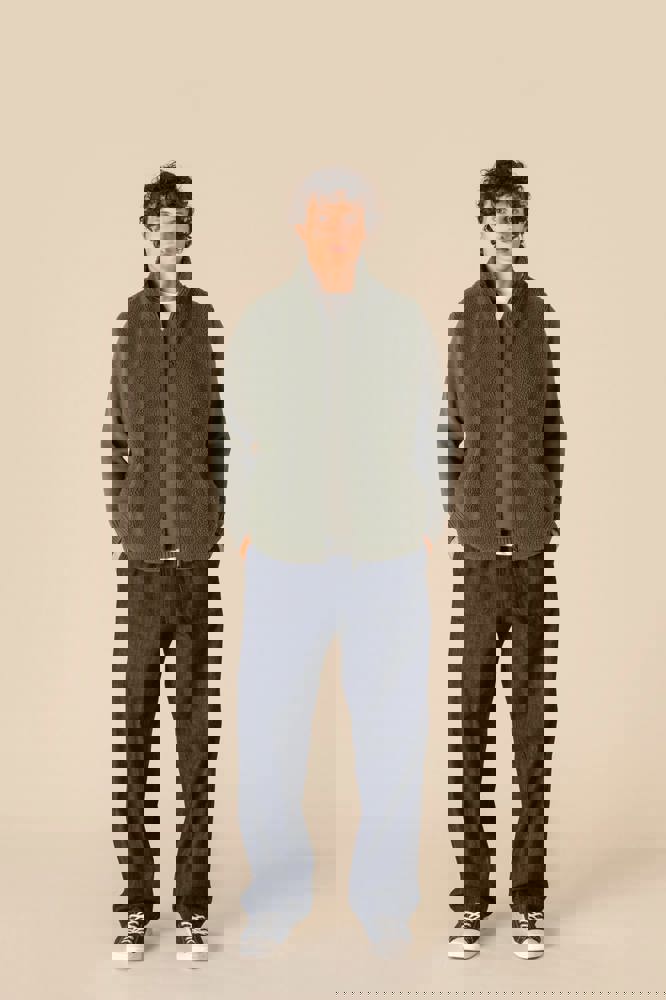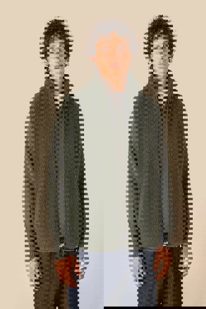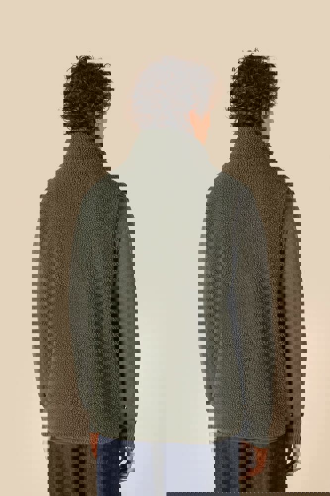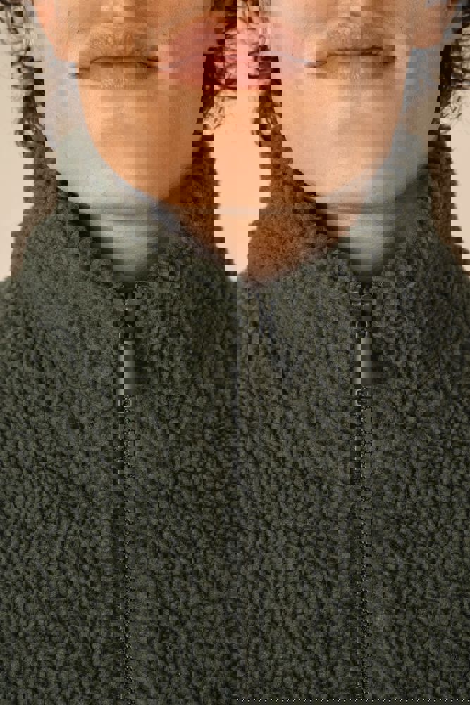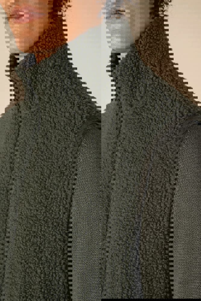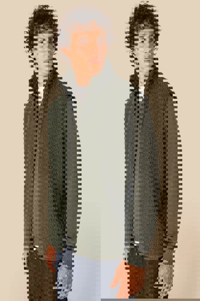 100 % Polyester. Reguläre Passform. Material aus Sherpa mit Hauptfutter aus Jersey. Doppelter Stehkragen aus Hauptmaterial. Krageninnenseite mit Nackenband mit tonalem Fischgrätenmuster. Kunststoffreißverschluss mit Ton-in-Ton-Metallschieber. Zwei paspelierte Taschen auf der Vorderseite. Ton-in-Ton-Schrägbandabschlüsse an den Armausschnitten und am unteren Rand des Kleidungsstücks. Reißverschluss zur individuellen Veredelung am unteren Rand des Kleidungsstücks.