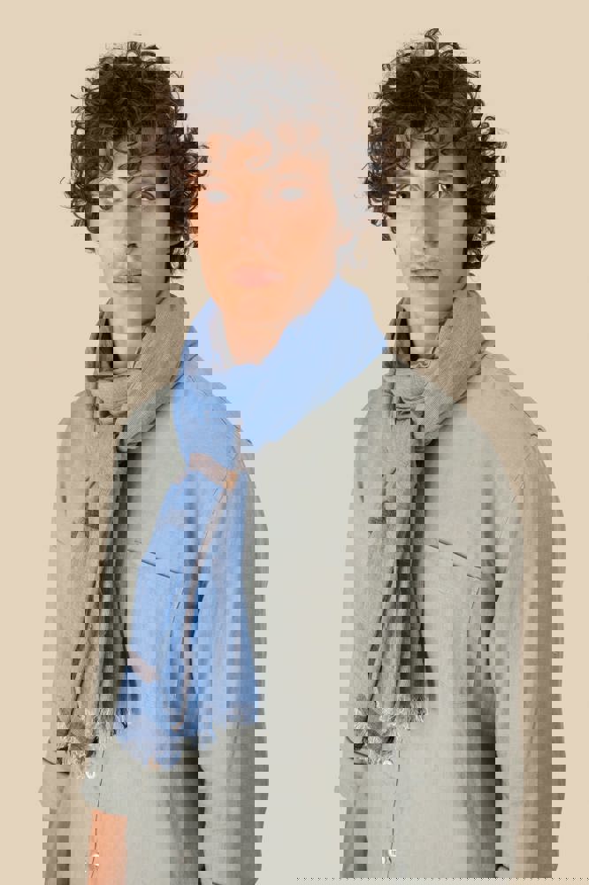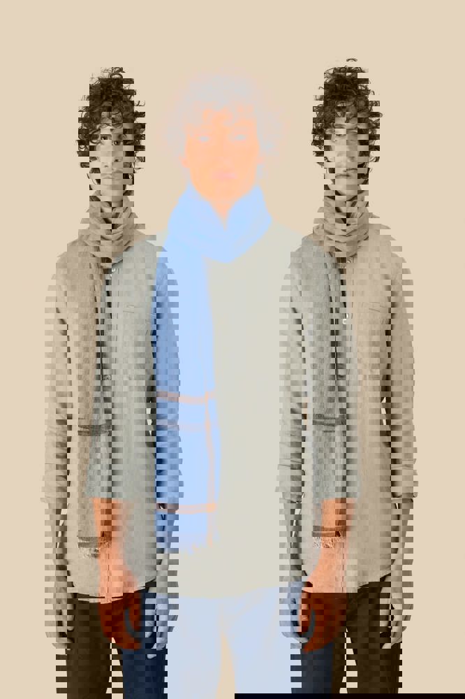 100 % Baumwolle. Gewebtes Schal mit Fransen, verziert mit kontrastierenden braunen und blauen Streifen. Unsere handgewebten Kopftücher können leichte Farbabweichungen von einem Stück zum anderen aufweisen, was ein Zeichen für unsere authentische Handwerkskunst ist.