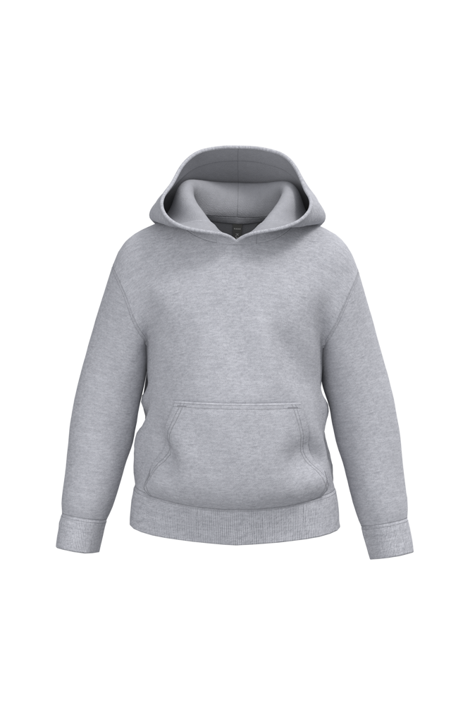 50% ringgesponnene Baumwolle / 50% recyceltes Post-Consumer-Polyester. Gebürstetes Molton. Gerader Schnitt. Geschnitten und genäht. Enzymwäsche. Schlauchförmige 2x1-Rippenbündchen für einen besseren Abschluss am Kragen, an den Ärmelenden und am Saum. Doppelte Ziernähte an Schultern, Armlöchern, unterem Saum und Ärmelabschluss. Kängurutaschen. Kapuze mit Jersey gefüttert. Ton-in-Ton-Jerseystreifen an der Innenseite des Kragens. Kein Markenetikett am Halsausschnitt, nur Größenangabe, zur einfacheren Veredelung.