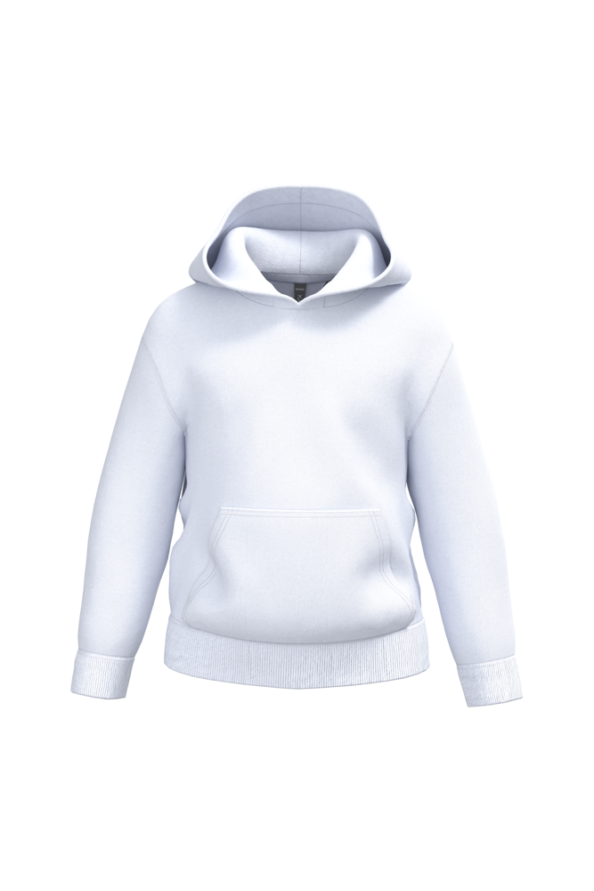 50% ringgesponnene Baumwolle / 50% recyceltes Post-Consumer-Polyester. Gebürstetes Molton. Gerader Schnitt. Geschnitten und genäht. Enzymwäsche. Schlauchförmige 2x1-Rippenbündchen für einen besseren Abschluss am Kragen, an den Ärmelenden und am Saum. Doppelte Ziernähte an Schultern, Armlöchern, unterem Saum und Ärmelabschluss. Kängurutaschen. Kapuze mit Jersey gefüttert. Ton-in-Ton-Jerseystreifen an der Innenseite des Kragens. Kein Markenetikett am Halsausschnitt, nur Größenangabe, zur einfacheren Veredelung.