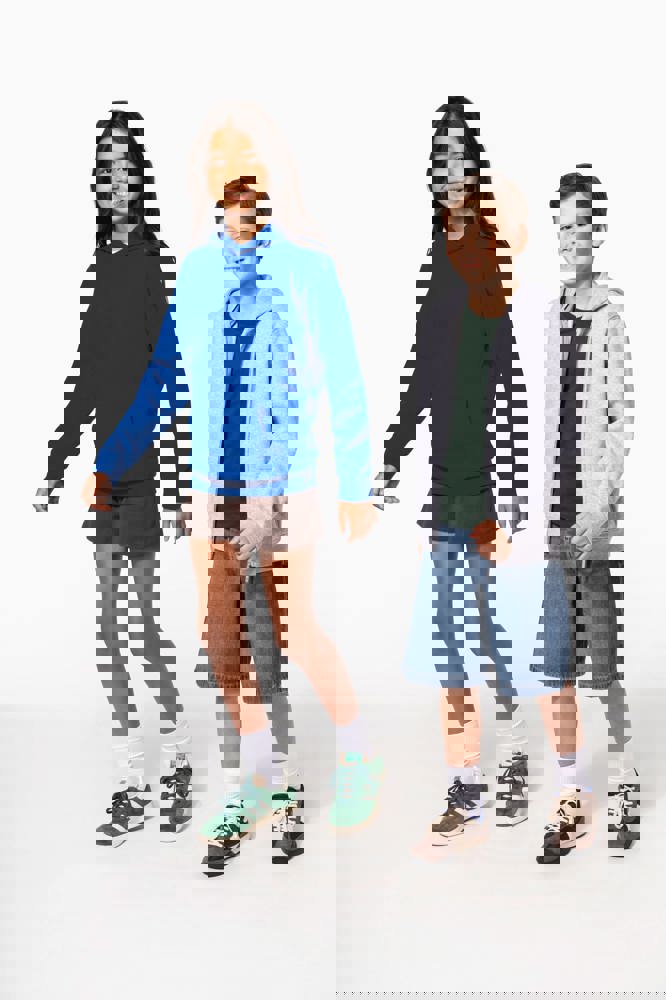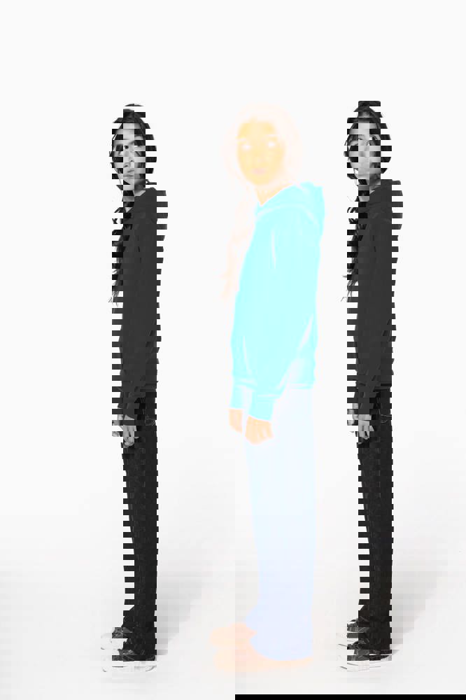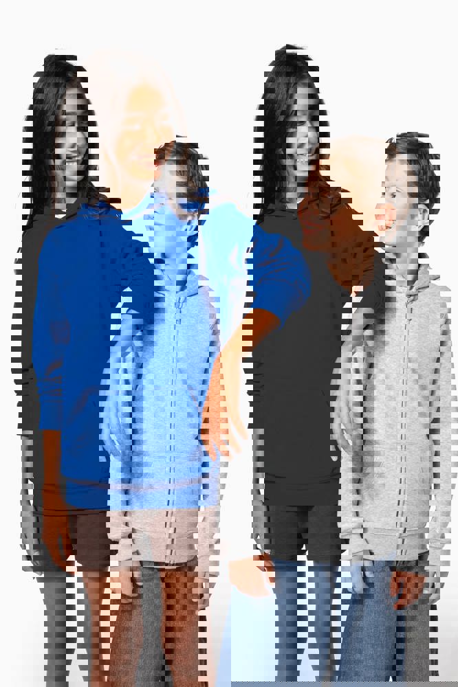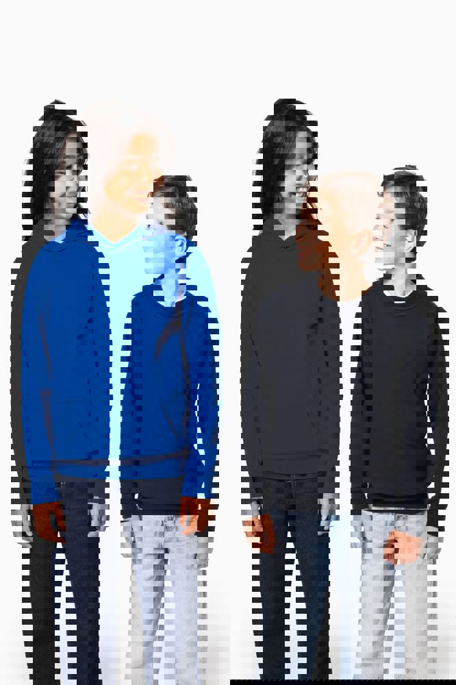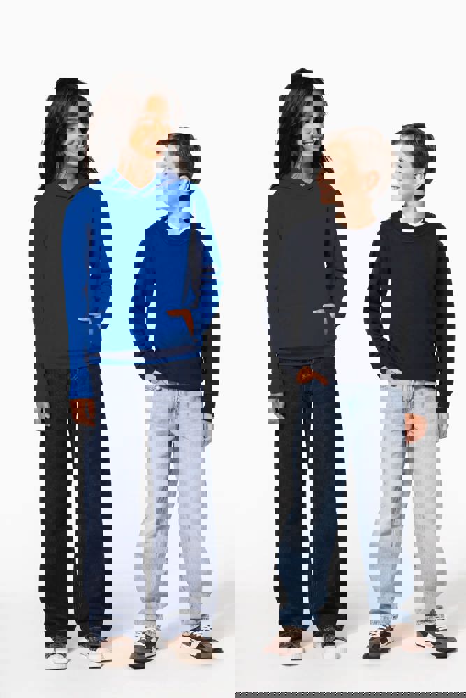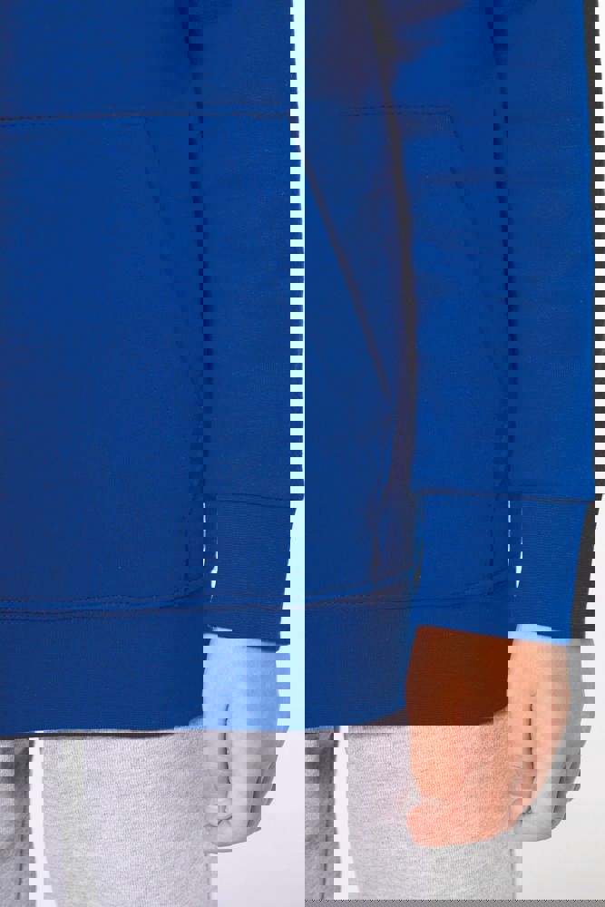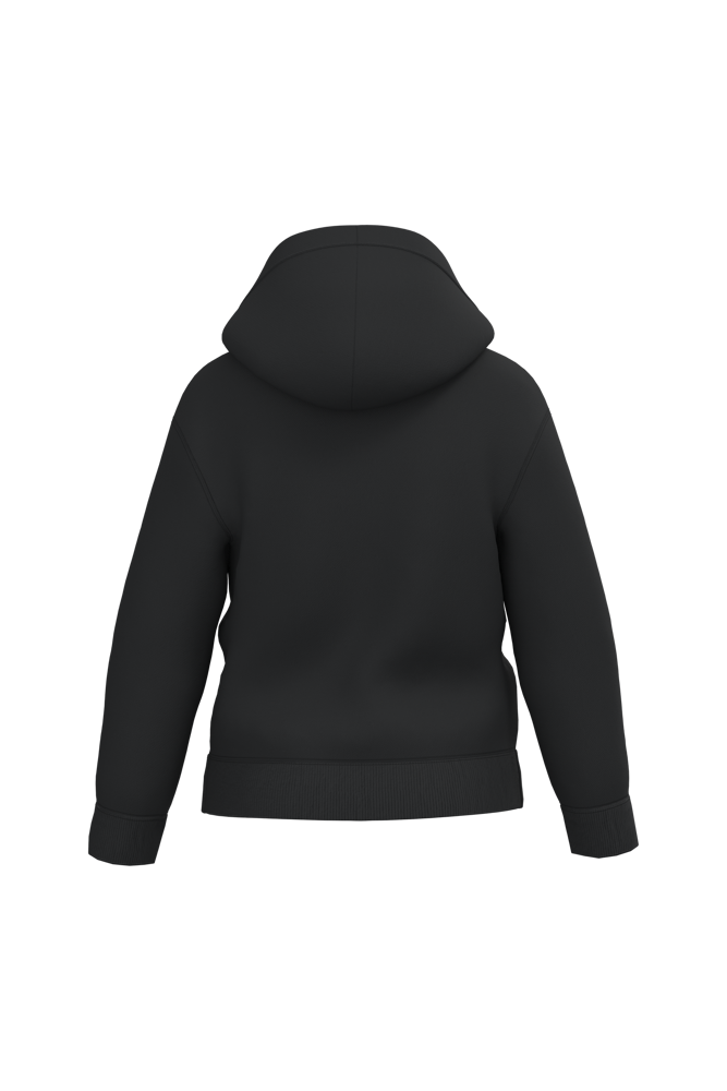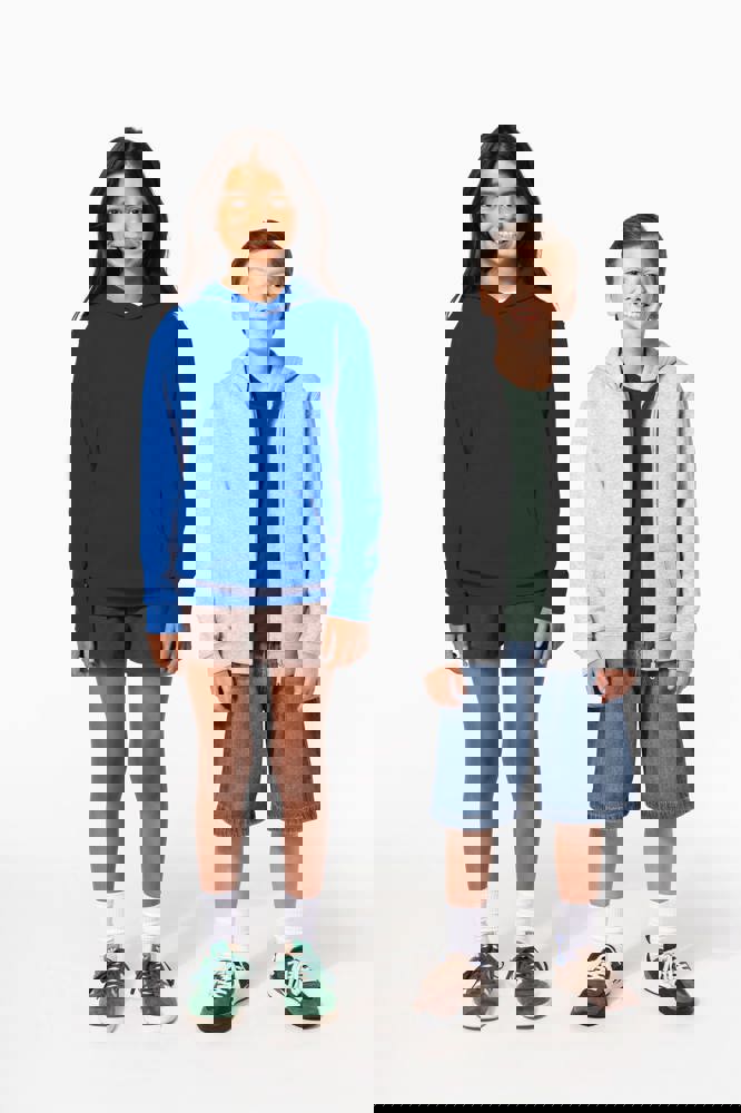 50% ringgesponnene Baumwolle / 50% recyceltes Post-Consumer-Polyester. Gebürstetes Molton. Gerader Schnitt. Geschnitten und genäht. Enzymwäsche. Schlauchförmige 2x1-Rippenbündchen für einen besseren Abschluss am Kragen, an den Ärmelenden und am Saum. Doppelte Ziernähte an Schultern, Armlöchern, unterem Saum und Ärmelabschluss. Kängurutaschen. Kapuze mit Jersey gefüttert. Ton-in-Ton-Jerseystreifen an der Innenseite des Kragens. Kein Markenetikett am Halsausschnitt, nur Größenangabe, zur einfacheren Veredelung.