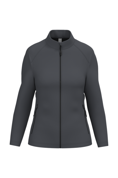 95 % Polyester / 5 % Elasthan. 2-Lagen-Softshell mit wasserabweisender Ausrüstung. Innen: 100 % Polyester in schwarzem Mikrofleece. Gerader Schnitt. Zwei Seitentaschen mit Polytrikot gefüttert, mit Nylon-Reißverschlüssen und schwarzen Reißverschlussanhängern. Schwarzer Nylon-Frontreißverschluss mit Kinnschutz und Zipper. Schulter- und Rückeneinsätze mit Ziernähten. Schwarzes Nackenband. Doppelnähte an Ärmel- und Saumabschlüssen. Abreißbares Markenetikett.