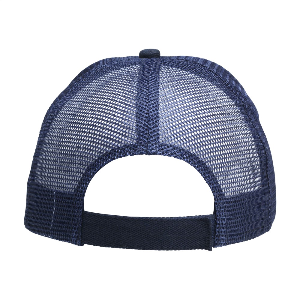 Trucker-Kappe mit 5 Panels mit vorgeformtem, gebogenem Schirm aus 60% gebürsteter, recycelter Baumwolle und 40% recyceltes Polyester. Rückseite aus Mesh-Struktur (Polyester) für optimale Belüftung. Mit Klettverschluss.
