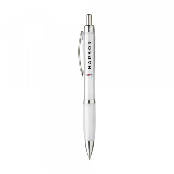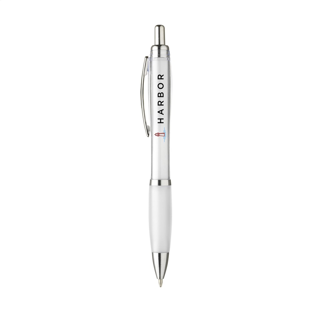 Blauschreibender oder schwarzschreibender Kugelschreiber mit transparentfarbener Gehäuse, grifffestem Vorderteil und Metallclip.