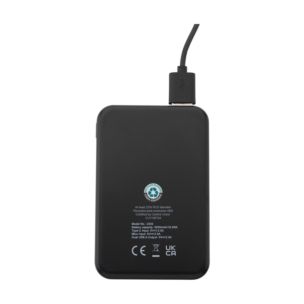 Kompakte, leistungsstarke Powerbank mit integriertem Li-Ion-Polymer-Akku (5.000 mAh). Das Gehäuse ist aus recyceltem ABS gefertigt. Ausgestattet mit 2 USB-A-Anschlüssen und einem USB-C-Anschluss. Eingang: Typ-C-5V/2,0A. Ausgang: Dual USB-A-DC5V/2,1A. Drahtloser Ausgang: 5 W. Kompatibel mit allen Mobilgeräten, die das drahtlose QI-Laden unterstützen. Mit Kontrollleuchten und Ein/Aus-Taste. Inklusive USB-C-Ladekabel und Gebrauchsanweisung. RCS-zertifiziert. Gesamtes recyceltes Material: 26%. Verpackt pro Stück.